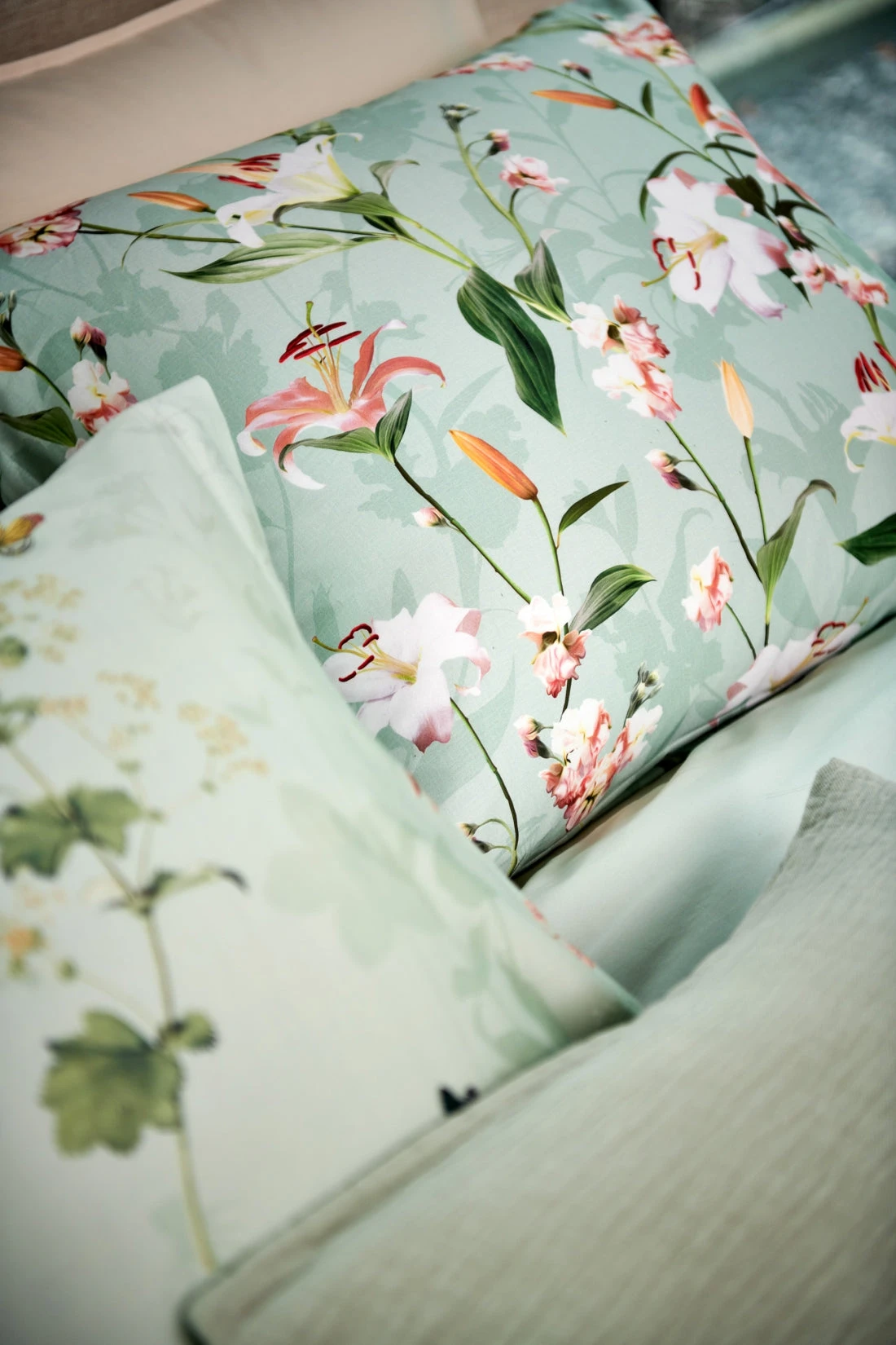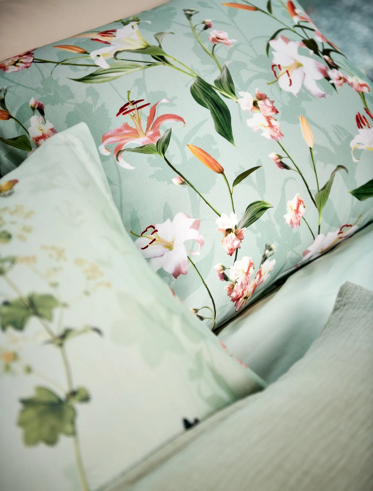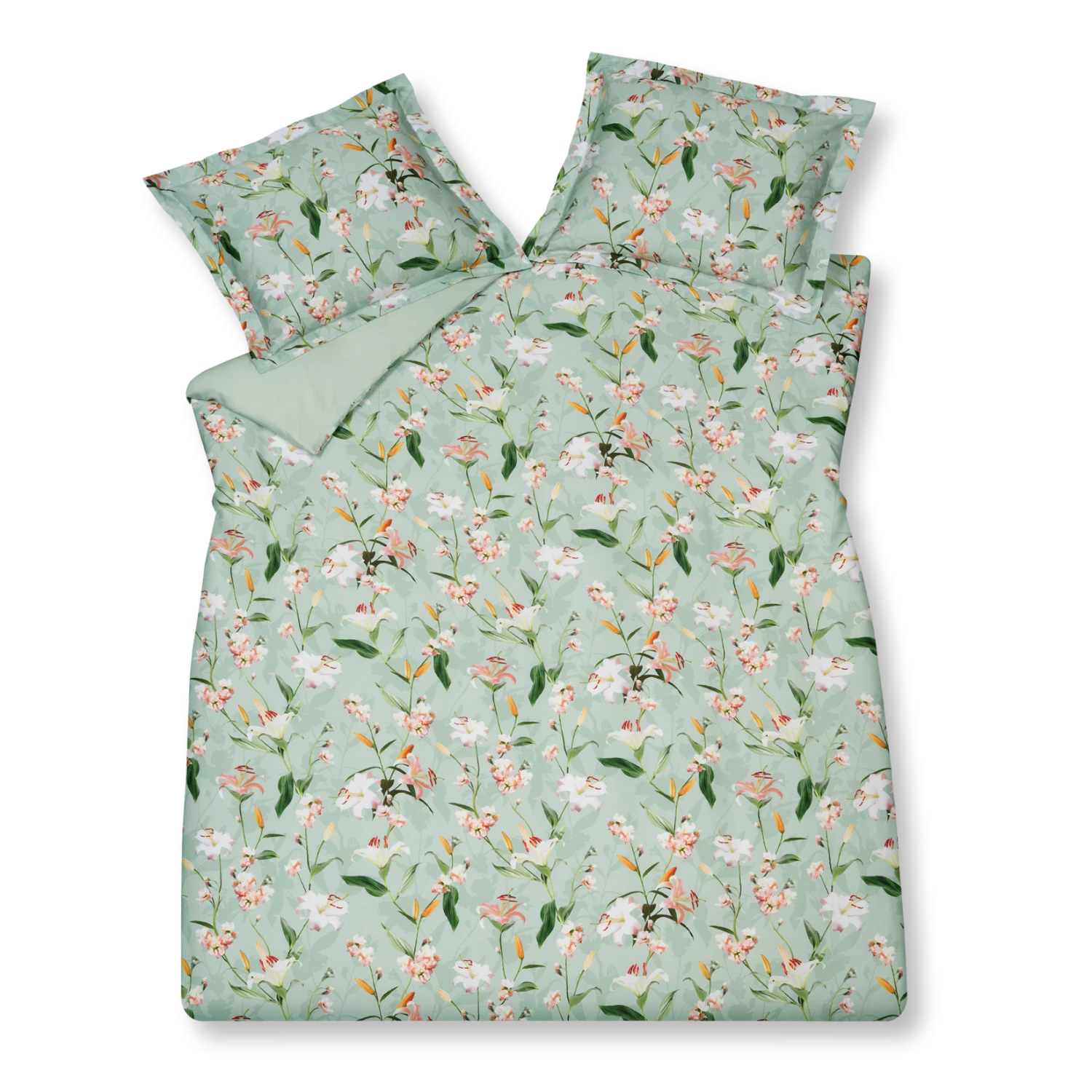 Azalea light green dekbedovertrek heeft roze en oranje bloemen die met veel details en schaduwen geschilderd lijken op een achtergrond van groene schaduwen. De achterkant van het dekbedovertrek is effen lichtgroen. De kussens hebben dezelfde bloemen. Door de digitale druk, komt de levensechte print helemaal tot leven. Azalea light green dekbedovertrek van Vandyck heeft een combinatie van prachtige zomerse bloemen op een rustgevende achtergrond. Dit 100% katoensatijnen dekbedovertrek biedt een luxueuze en comfortabele slaapervaring dankzij de zachte, soepele textuur en ademende eigenschappen. Het speciale weefsel van fijne katoengaren zorgt voor een glad oppervlak en lichte glans. Hierdoor voelt het heerlijk zacht op de huid, wat zorgt voor comfortabel slapen. Bovendien reguleert katoen van nature de lichaamstemperatuur en absorbeert het vocht, wat resulteert in een aangenaam slaapklimaat en goede nachtrust.