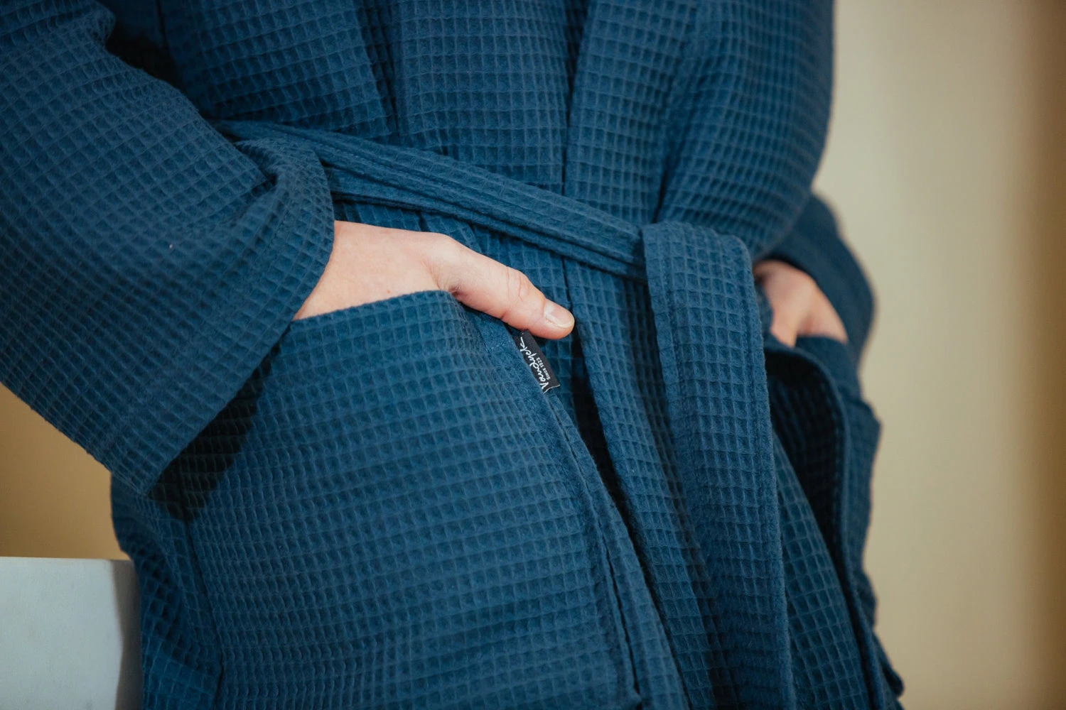 De Biarritz badjas in navy is een uni badjas met een wafel structuur. De lange badjas heeft aan de beide zijden grote insteek zakken en een lusje in de kraag zodat je je badjas handig kunt ophangen.