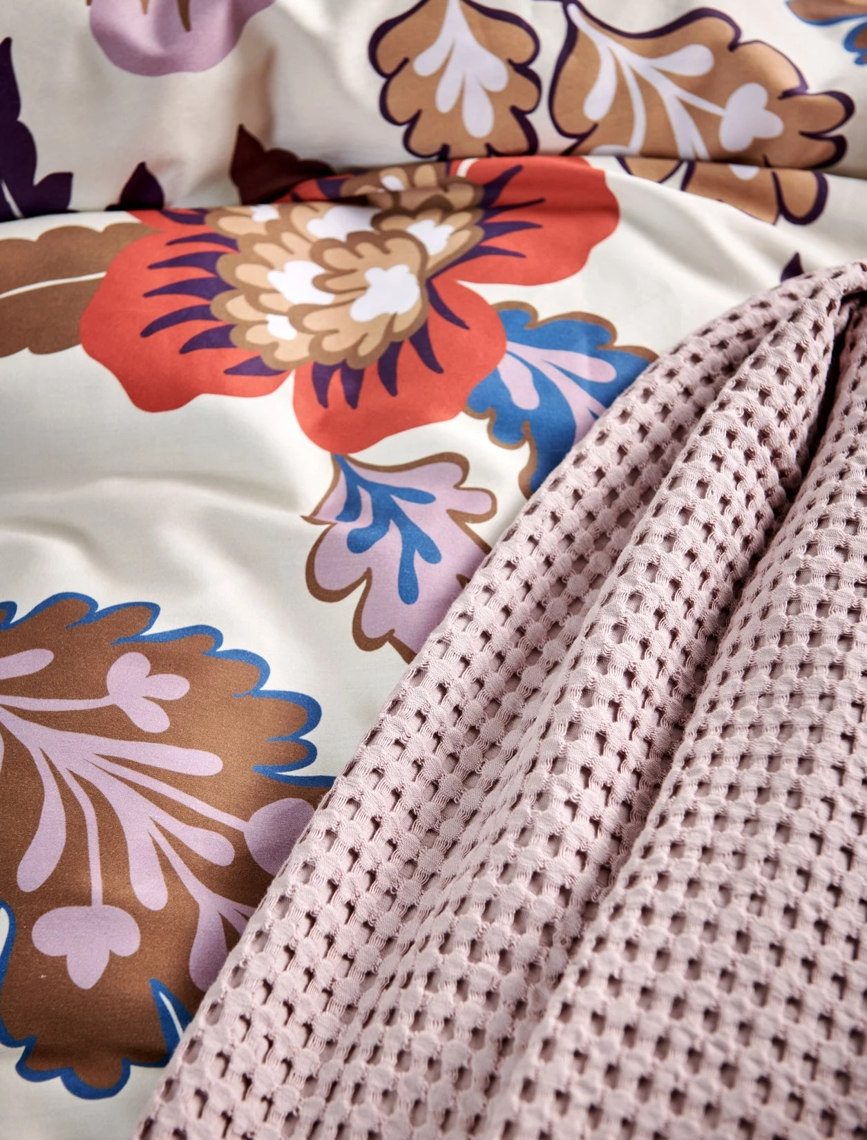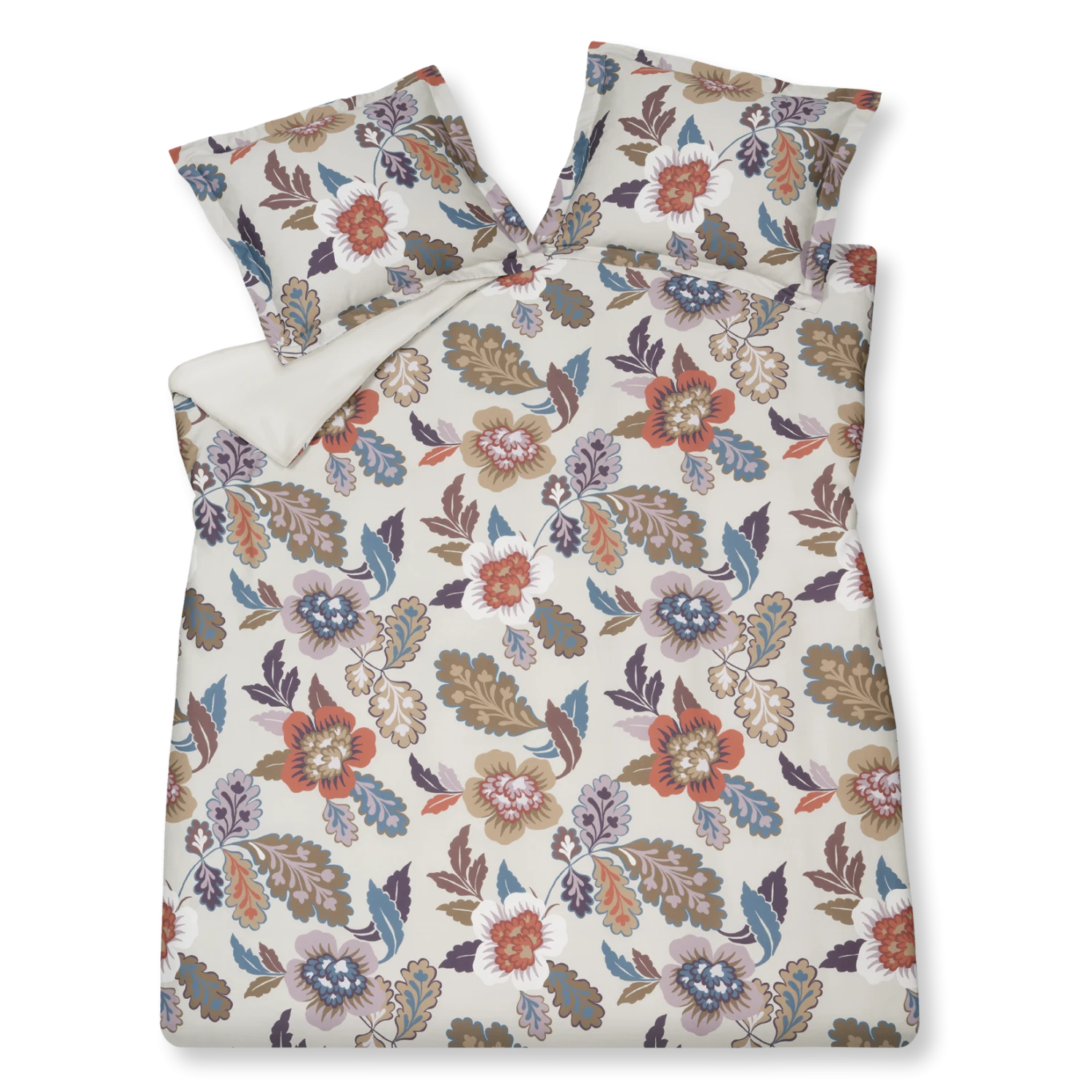 Boheme Flower multi dekbedovertrek heeft grote abstract getekende bloemen en bladeren in verschillende tinten bruin, paars, blauw en oranje op een beige achtergrond. De achterkant van het dekbedovertrek is effen beige. De kussens hebben aan beide zijden dezelfde bloemen. Door de digitale druk, komt de levensechte print helemaal tot leven. Boheme Flower multi dekbedovertrek van Vandyck geeft met het levenslustige patroon een positieve en energieke vibe aan je slaapkamer. Dit 100% katoensatijnen dekbedovertrek biedt een luxueuze en comfortabele slaapervaring dankzij de zachte, soepele textuur en ademende eigenschappen. Het speciale weefsel van fijne katoengaren zorgt voor een glad oppervlak en lichte glans. Hierdoor voelt het heerlijk zacht op de huid, wat zorgt voor comfortabel slapen. Bovendien reguleert katoen van nature de lichaamstemperatuur en absorbeert het vocht, wat resulteert in een aangenaam slaapklimaat en goede nachtrust.