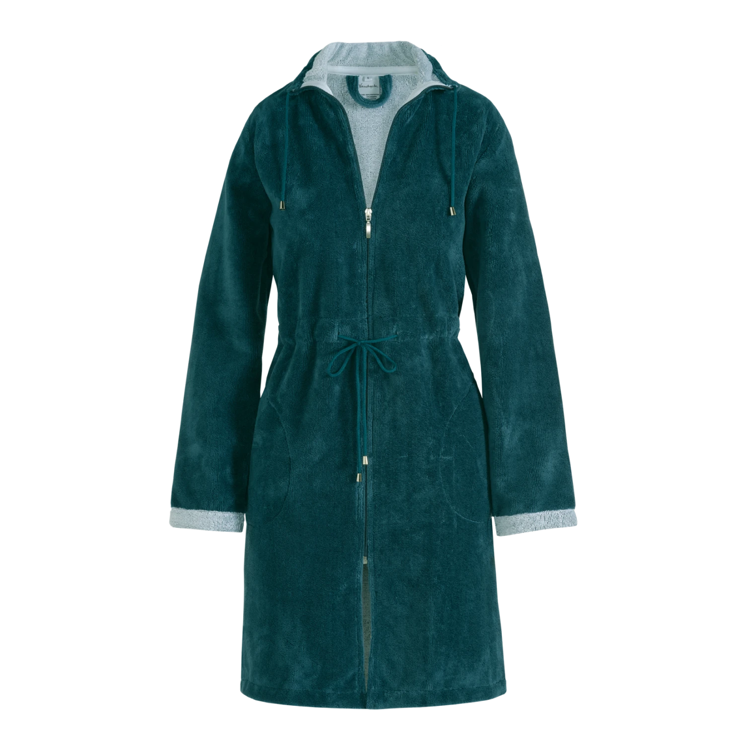 Chicago badjas is een effen velours badjas met een ritssluiting. Het is een prachtige korte badjas met een zachte glans, die gevoerd is met bamboe. De Chicago badjas van Vandyck heeft een chique uitstraling doordat de badjas getailleerd kan worden met een koord. Deze badjas is geschikt voor dames.