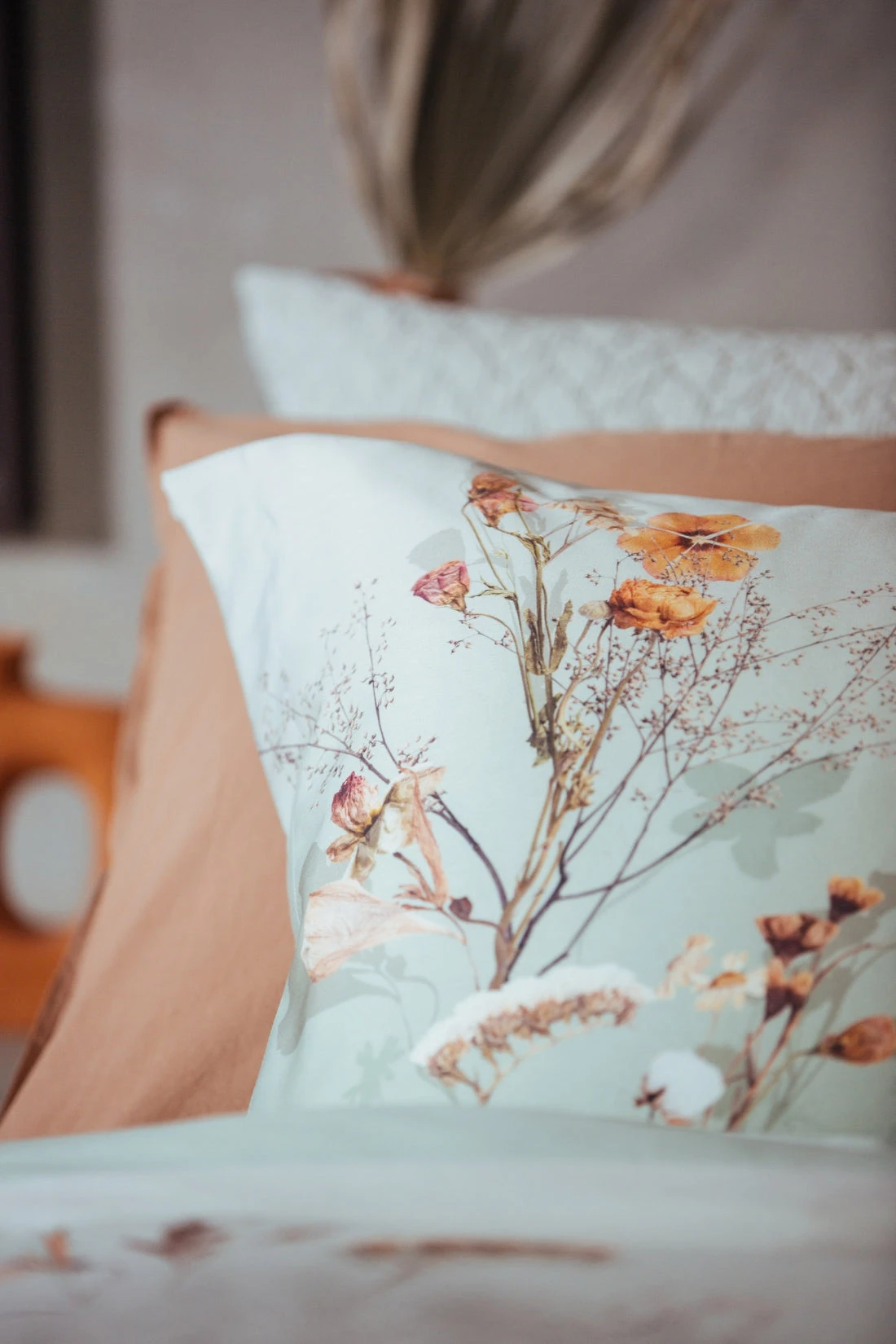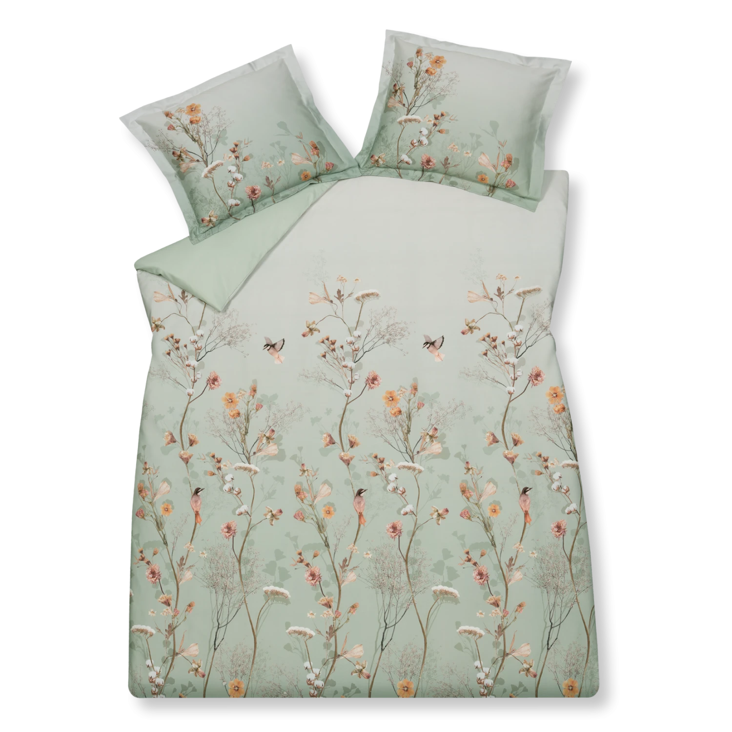 Het smoke green dekbedovertrek Cotton Bloom is versierd met prachtige oranje droogbloemen, katoenplanten en vogels. De natuurlijke groene tint laat de print prachtig uitkomen en is ook terug te vinden op de kussenslopen. De achterkant van het dekbedovertrek is effen lichtgroen. Door de lichte en natuurlijke tinten geeft het Cotton Bloom dekbedovertrek van Vandyck een kalme uitstraling aan je slaapkamer.