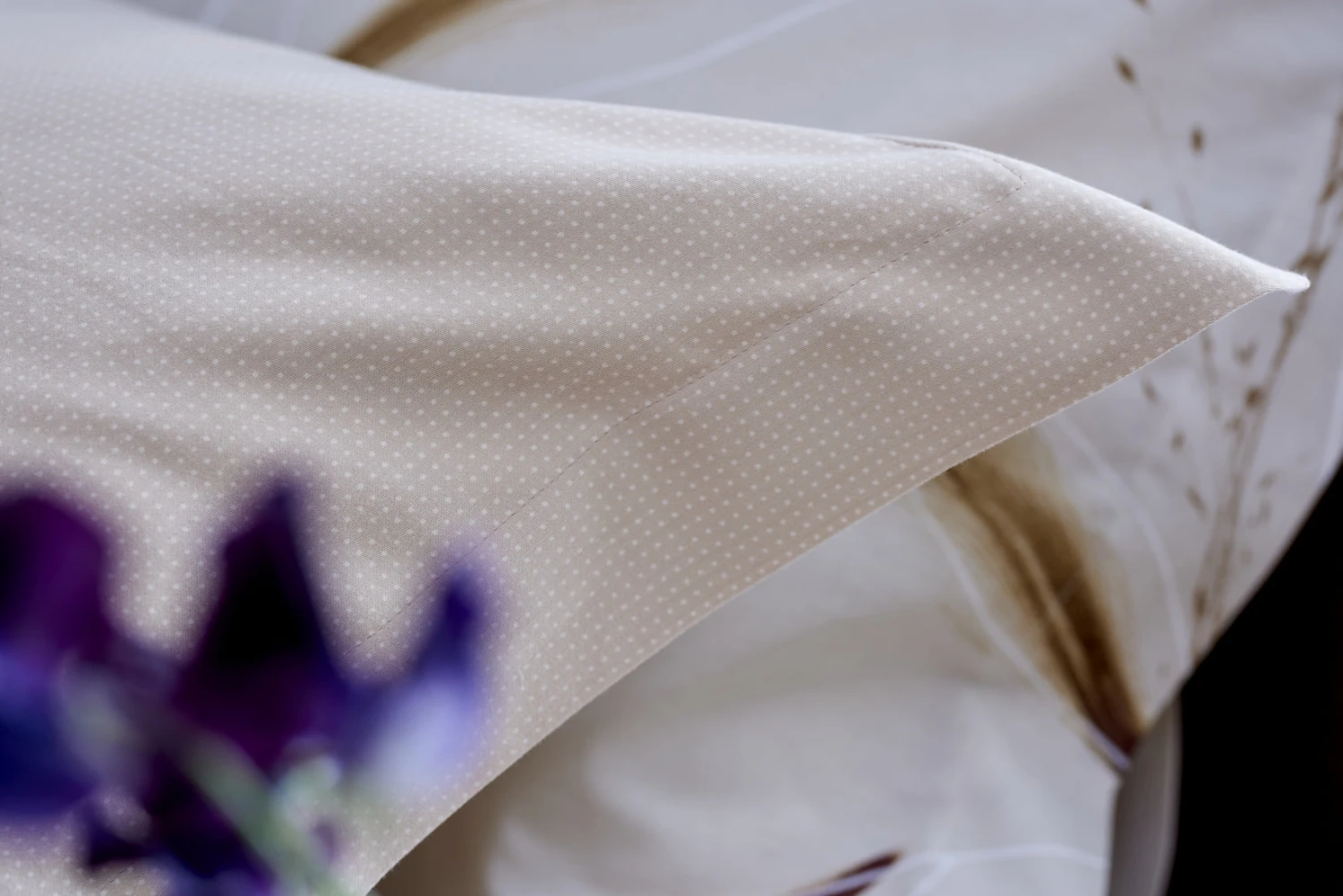 Dots is een effen dekbedovertrekset dat bezaaid is met stippen aan de voorzijde. De achterzijde is effen. Door de kleine stippen geeft dit een speels effect maar door de rustige kleuren blijft dit in balans. Dots is een speels dekbedovertrekset dat verkrijgbaar is in de kleuren latte en sage green.