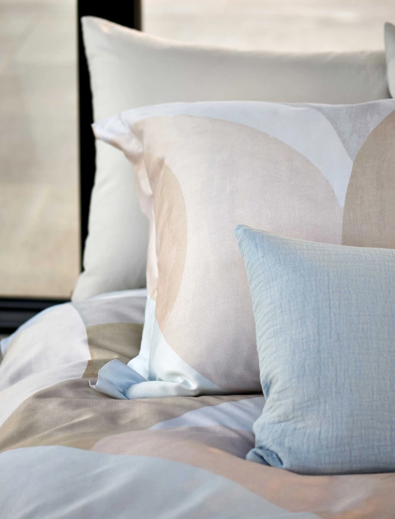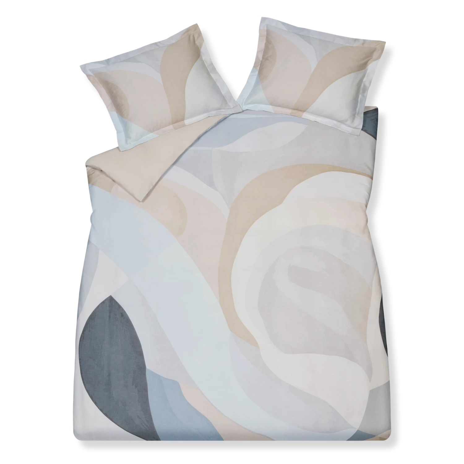 Elements multi dekbedovertrek heeft organische vormen die in elkaar overlopen in verschillende pasteltinten blauw, grijs, beige en wit. De achterkant van het dekbedovertrek is effen pastel beige. De kussens hebben aan beide zijden een deel uit het midden van het patroon. Elements multi dekbedovertrek van Vandyck doet denken aan een kunstwerk met verf waar verschillende kleuren gemengd worden, die een soort marmereffect creeren. De organische vormen zijn niet vast omlijnd en geven ruimte om uit je eigen vaste patronen te stappen en te genieten van de nieuwe gedachtes die onstaan. Dit 100% katoensatijnen dekbedovertrek biedt een luxueuze en comfortabele slaapervaring dankzij de zachte, soepele textuur en ademende eigenschappen. Het speciale weefsel van fijne katoengaren zorgt voor een glad oppervlak en lichte glans. Hierdoor voelt het heerlijk zacht op de huid, wat zorgt voor comfortabel slapen. Bovendien reguleert katoen van nature de lichaamstemperatuur en absorbeert het vocht, wat resulteert in een aangenaam slaapklimaat en goede nachtrust.