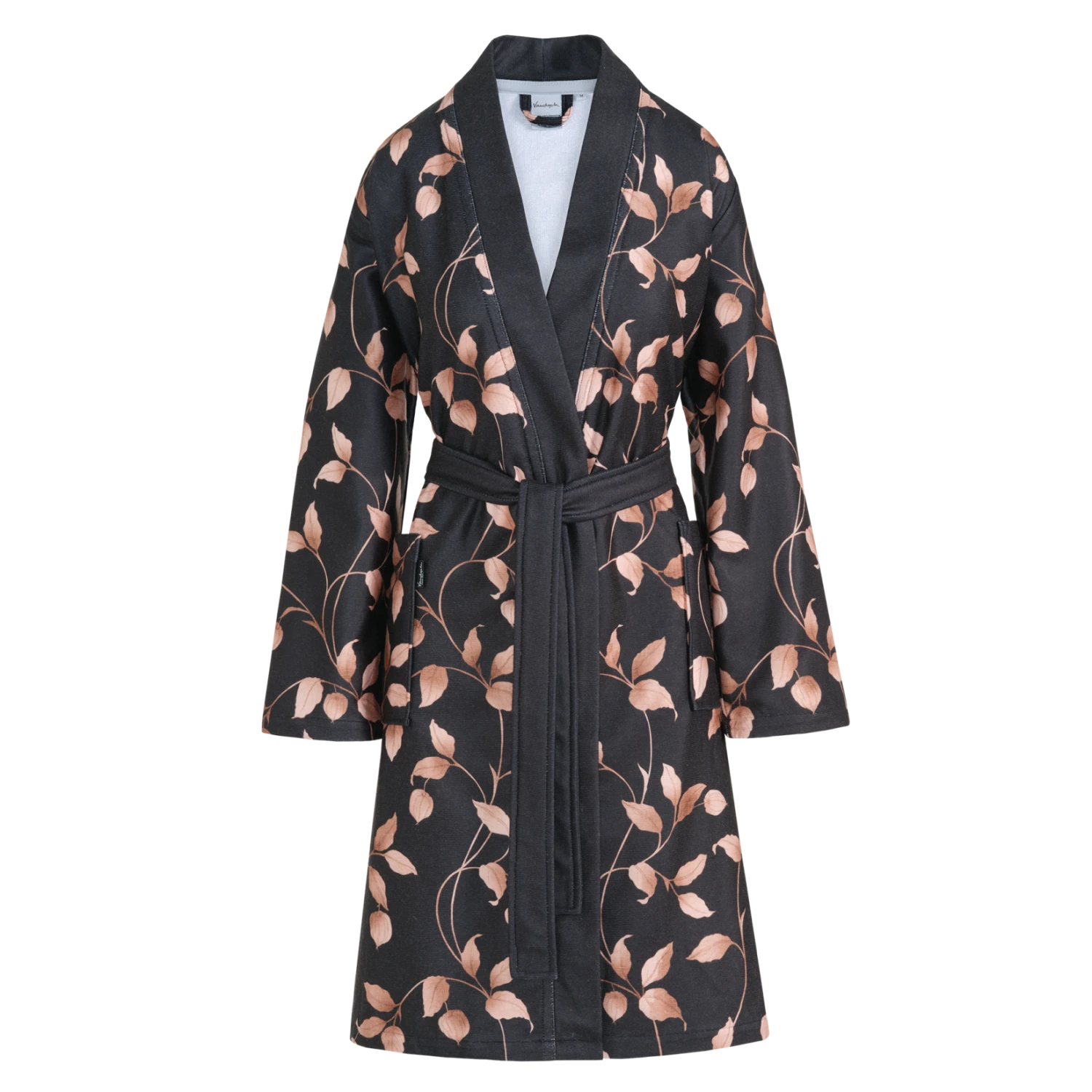 De mooie Elena blue ink badjas heeft terracotta kleurige blaadjes, die lijken te dansen op een donkerblauwe achtergrond. Deze badjas van Vandyck is afgewerkt met grote steekzakken, brede donkerblauwe revers en wordt gesloten met een ceintuur. Doordat de badjas gemaakt is met een combinatie van bamboe, katoen en polyester, voelt het niet alleen licht aan, maar ademt het ook. Maak de look compleet met het bijpassende dekbedovertrek Serene blue ink.