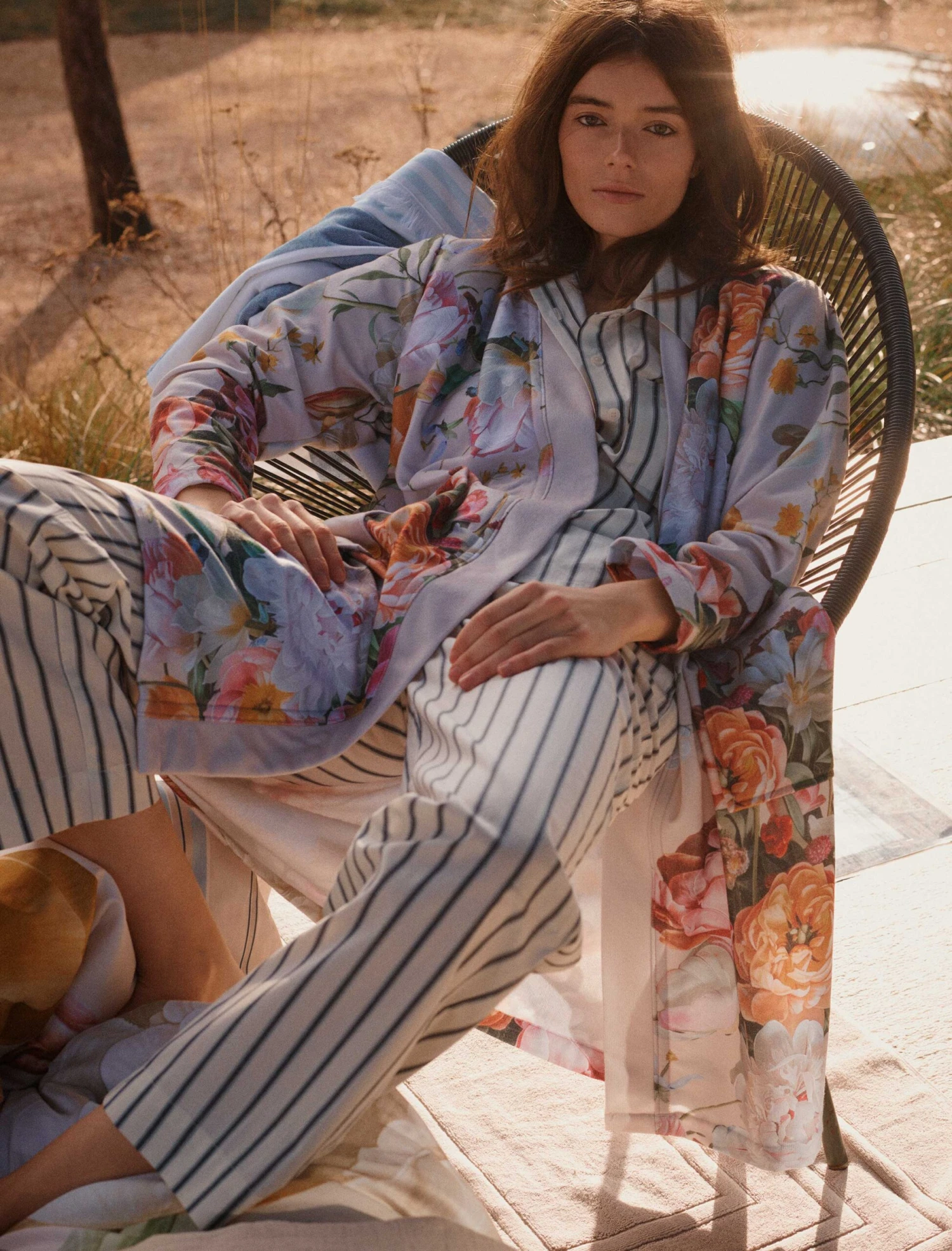 Fleur cream tan badjas is een korte badjas met hele grote bloemen in lichte pasteltinten in allerlei blauw, roze en oranje schakeringen op een beige achtergrond. De badjas heeft een brede effen revers en wordt gesloten met een ceintuur. De Fleur cream tan badjas van Vandyck heeft een weelderige uitstraling en past perfect bij een ontbijt in de zon op het balkon of in de tuin. Het is ook beschikbaar in de kleur lavender blue. Het is gemaakt van 45% bamboe, 20% katoen en 35% polyester. Hierdoor heeft de badjas niet alleen een goed absorptievermogen, het is ook lekker licht om te dragen. De Fleur cream tan badjas matcht goed met het Fleur Festive dekbedovertrek.Â