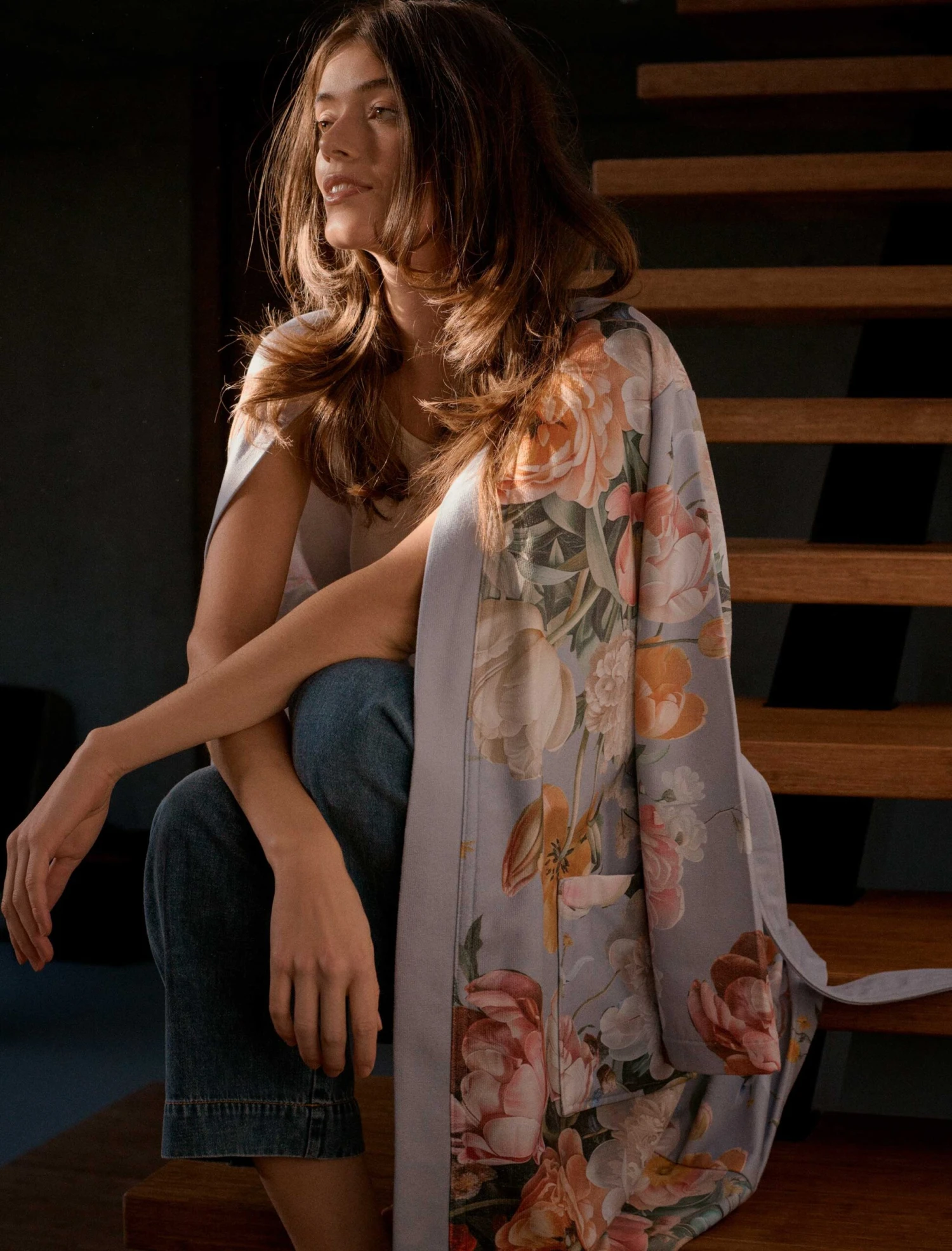 Fleur lavender blue badjas is een korte badjas met hele grote bloemen in lichte pasteltinten in allerlei blauw, roze en oranje schakeringen op een pastel blauw/paarse achtergrond. De badjas heeft een brede effen revers en wordt gesloten met een ceintuur. De Fleur cream tan badjas van Vandyck heeft een weelderige uitstraling en past perfect bij een ontbijt in de zon op het balkon of in de tuin. Het is ook beschikbaar in de kleur lavender blue. Het is gemaakt van 45% bamboe, 20% katoen en 35% polyester. Hierdoor heeft de badjas niet alleen een goed absorptievermogen, het is ook lekker licht om te dragen. De Fleur cream tan badjas matcht goed met het Fleur Festive dekbedovertrek.Â