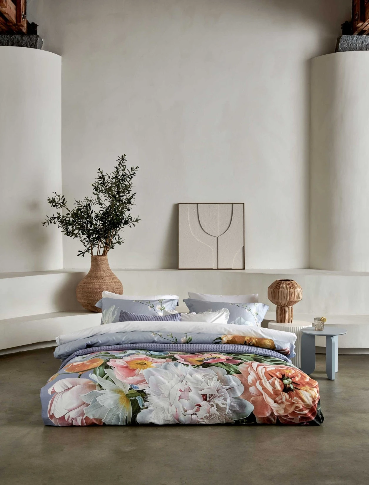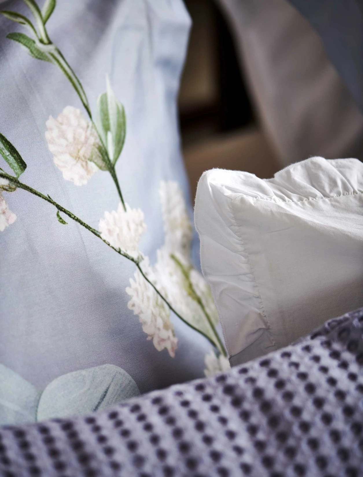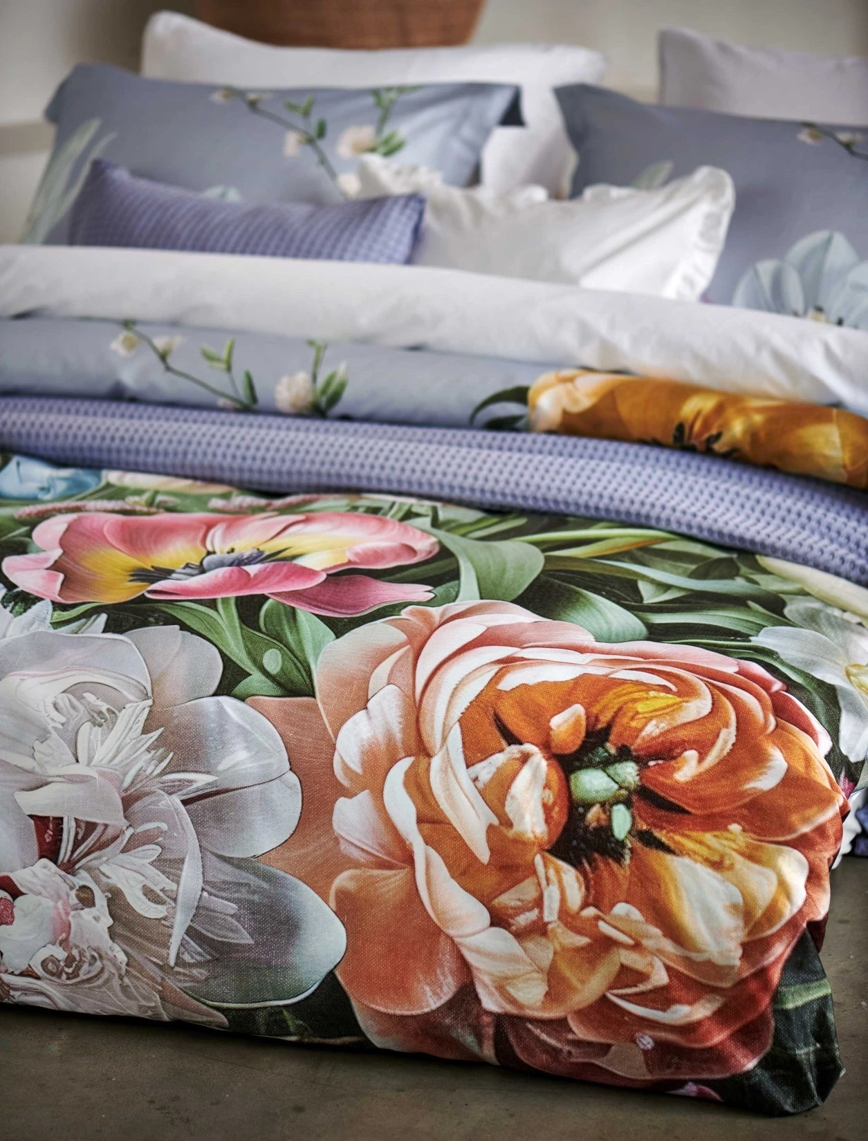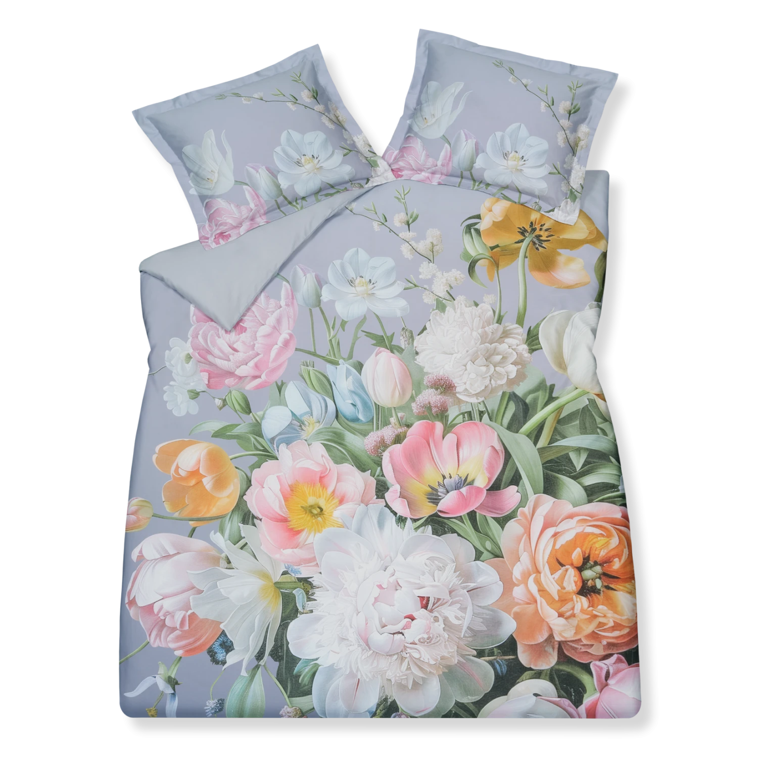 Fleur Festive lavender blue dekbedovertrek heeft hele grote bloemen in lichte pasteltinten in allerleid blauw, roze en oranje schakeringen op een pastel blauw / paarse achtergrond. De achterkant van het dekbedovertrek is effen pastel blauw/paars. De kussens hebben aan beide kanten een paar bloemen en een bloesemtak. Fleur Festive lavender blue dekbedovertrek van Vandyck tovert je slaapkamer in een weelderige tuin met ontluikende bloemen. Het is ook beschikbaar in de kleur cream tan en heeft ook een bijpassende badjas, Fleur in lavender blue. Dit 100% katoensatijnen dekbedovertrek biedt een luxueuze en comfortabele slaapervaring dankzij de zachte, soepele textuur en ademende eigenschappen. Het speciale weefsel van fijne katoengaren zorgt voor een glad oppervlak en lichte glans. Hierdoor voelt het heerlijk zacht op de huid, wat zorgt voor comfortabel slapen. Bovendien reguleert katoen van nature de lichaamstemperatuur en absorbeert het vocht, wat resulteert in een aangenaam slaapklimaat en goede nachtrust.
