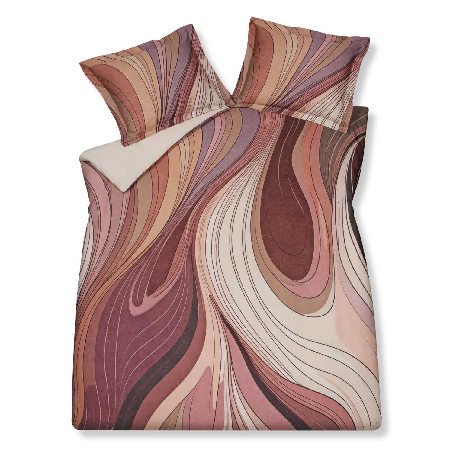 Fortunate ash rose dekbedovertrek heeft organische vormen in verschillende tinten rood, roze, beige en paars, die doen denken aan zandlagen of kleuren die gemengd worden. De manier waarop het gedrukt is lijkt het alsof het op ruwe stof geverfd is. De achterkant van het dekbedovertrek is effen off white. De kussens hebben aan beide kanten een deel van het patroon. De kleurvlakken van Fortunate ash rose dekbedovertrek van Vandyck lijken in continue beweging te zijn en je mee te voeren naar andere oorden. Dit 100% katoensatijnen dekbedovertrek biedt een luxueuze en comfortabele slaapervaring dankzij de zachte, soepele textuur en ademende eigenschappen. Het speciale weefsel van fijne katoengaren zorgt voor een glad oppervlak en lichte glans. Hierdoor voelt het heerlijk zacht op de huid, wat zorgt voor comfortabel slapen. Bovendien reguleert katoen van nature de lichaamstemperatuur en absorbeert het vocht, wat resulteert in een aangenaam slaapklimaat en goede nachtrust.