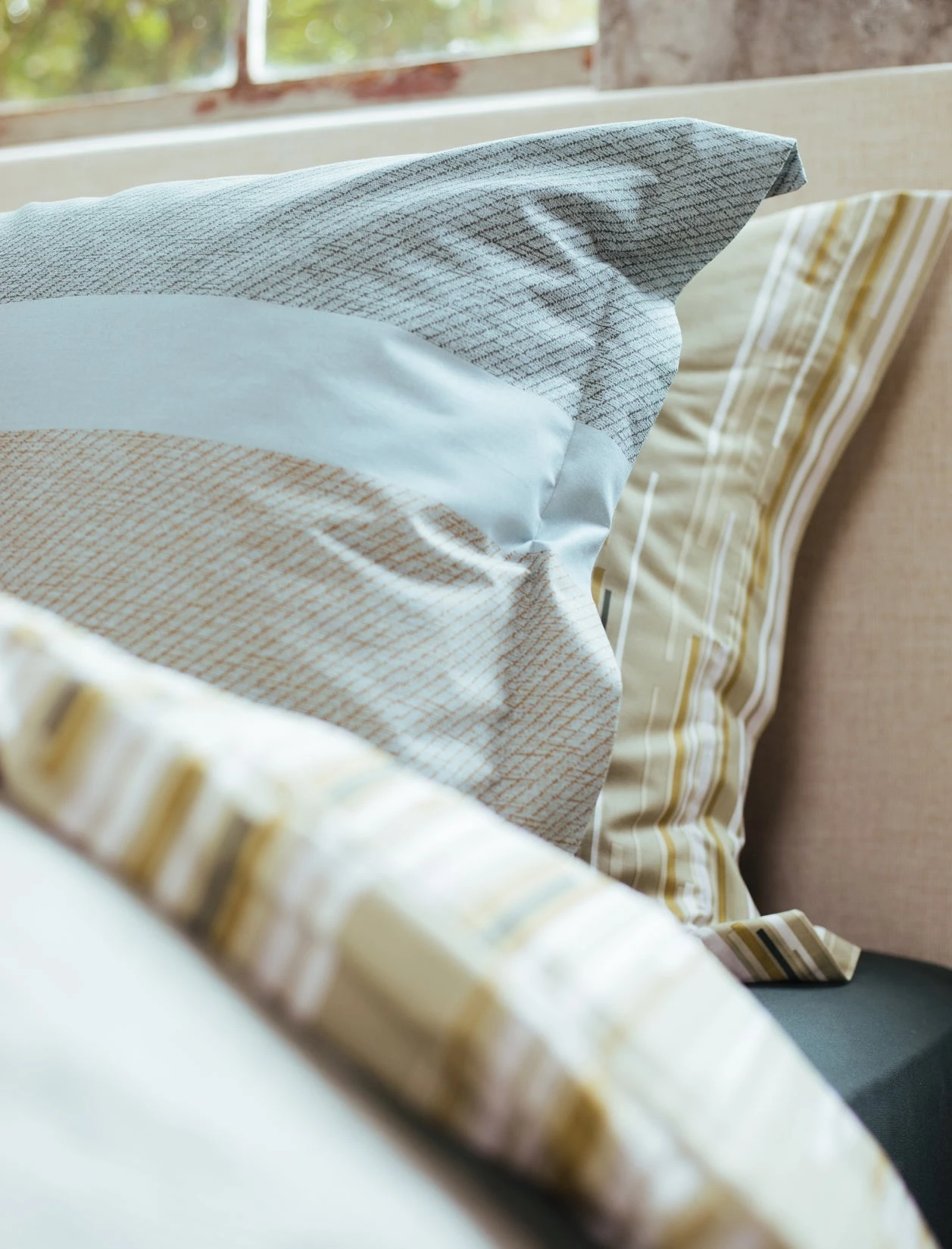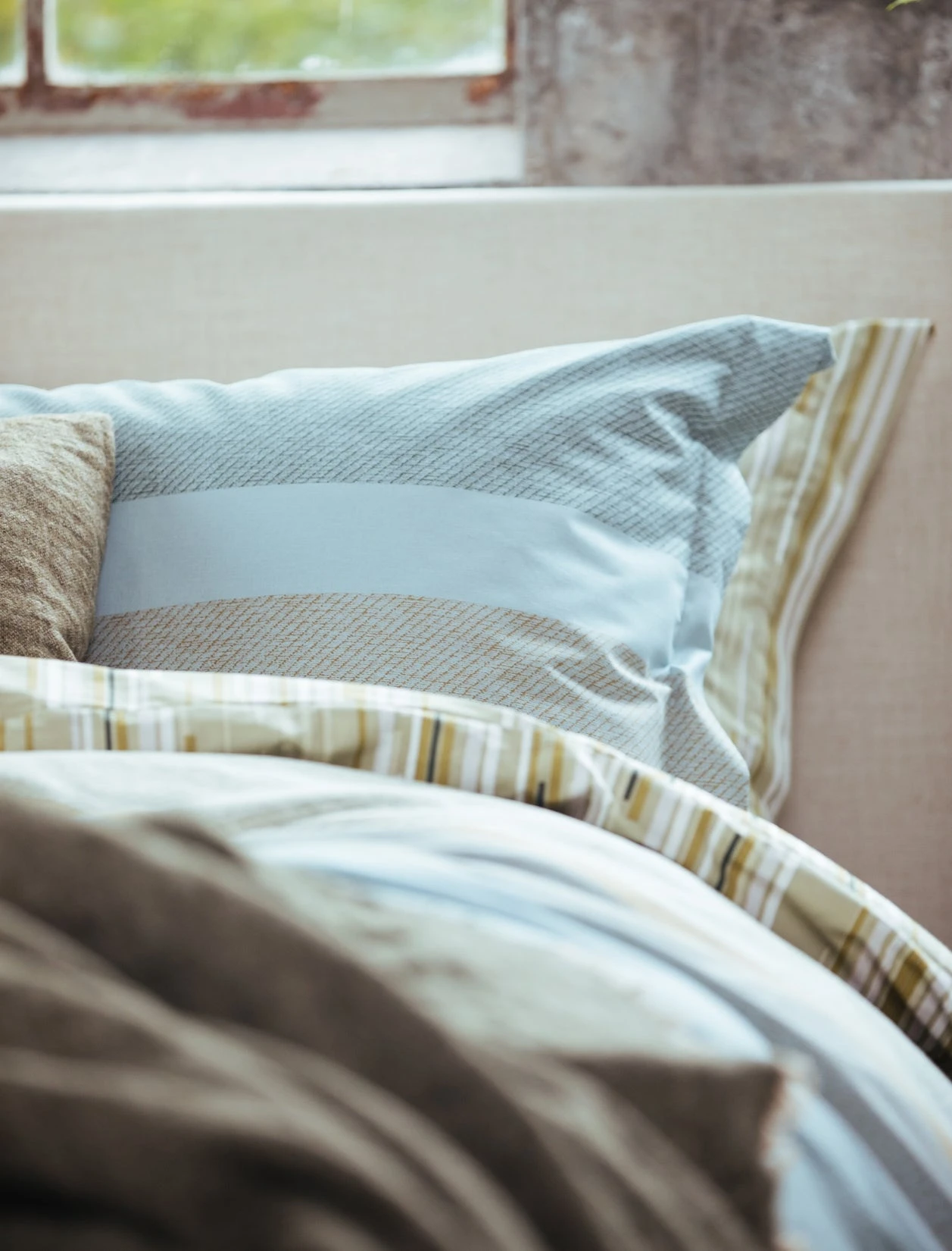 Green Shoot smoke green dekbedovertrek heeft brede strepen in verschillende tinten groen, blauw en geel en lijkt grover geweven te zijn. De achterkant van het dekbedovertrek heeft dezelfde print. De kussens hebben aan beide zijden blauwe, groene strepen en een goudkleurige streep voor een elegante touch. Green Shoot smoke green dekbedovertrek van Vandyck heeft door de zachter kleuren en de ruwer geweven look een gemoedelijke en landelijke uitstraling. Het is gemaakt van 100% katoen hierdoor is het materiaal sterker, maar voelt het toch zacht aan. Het is een ademend en zacht materiaal dat een comfortabele nachtrust garandeert. Het katoen zorgt ervoor dat je huid kan ademen en reguleert de temperatuur, waardoor je het hele jaar door kunt genieten van een aangename slaapomgeving.