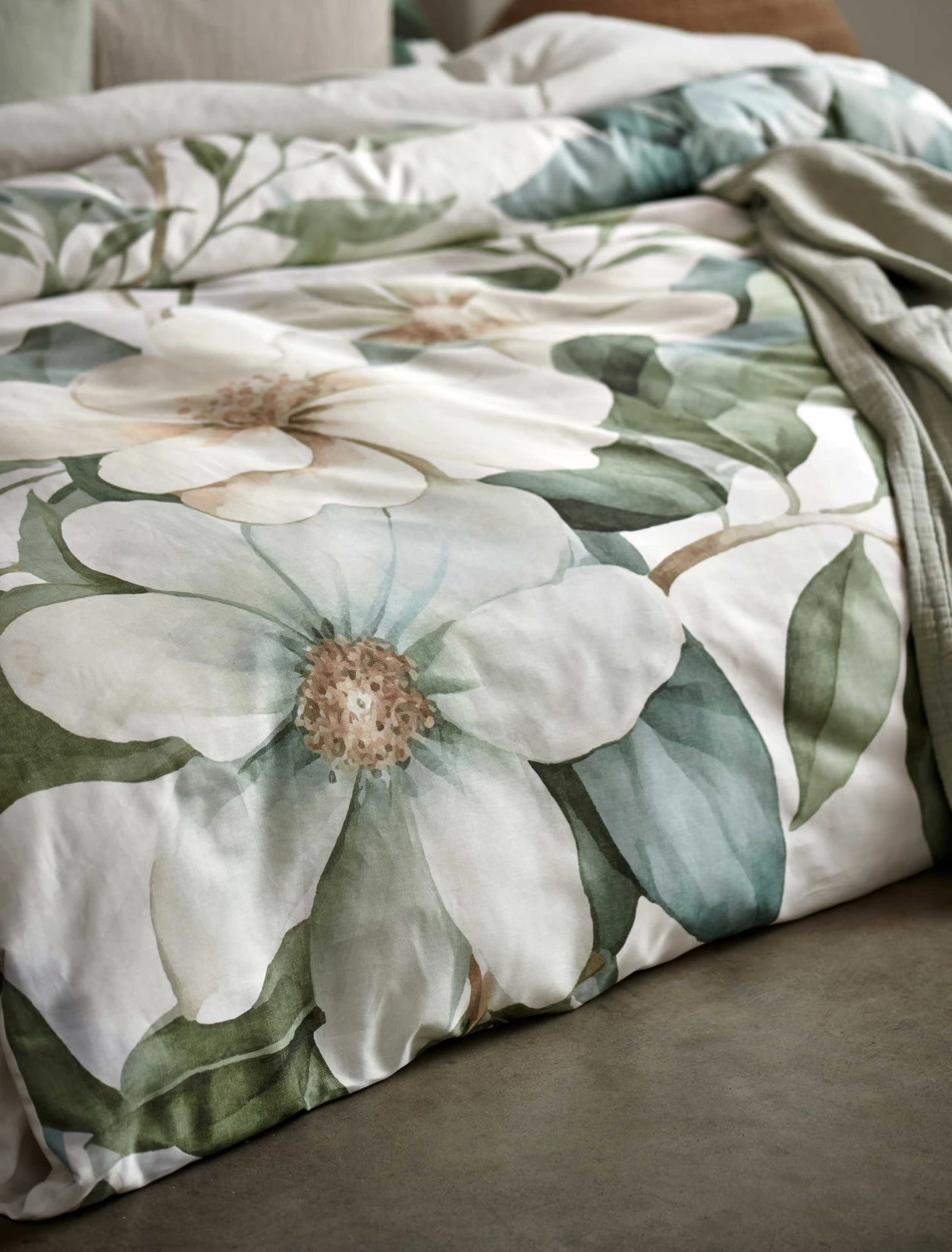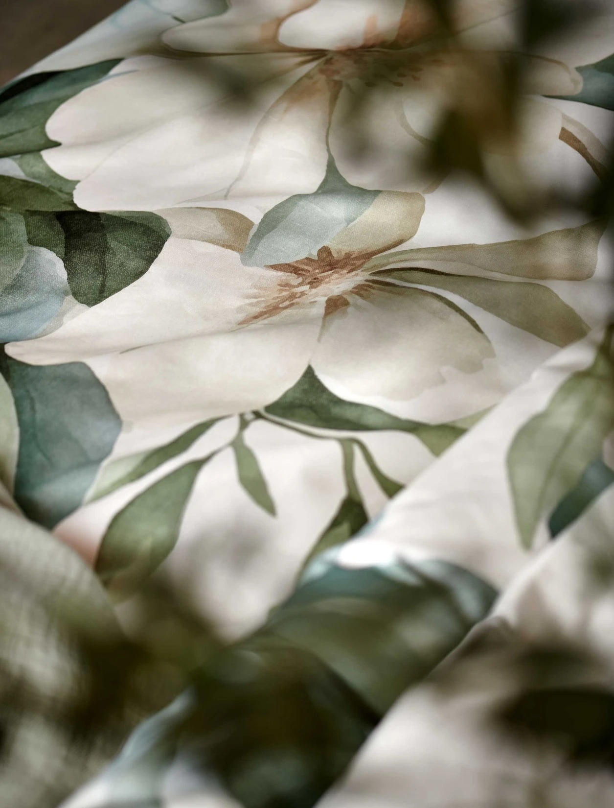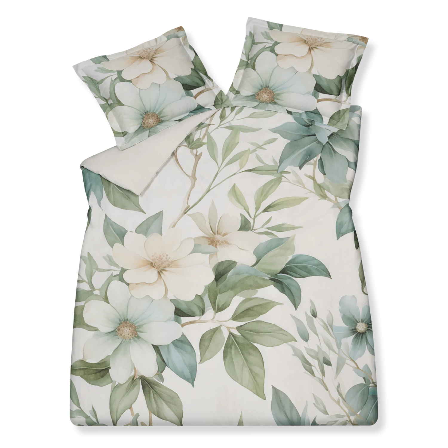 Greenscape thyme dekbedovertrek heeft grote bloemen met creme en groene tinten met groene bladeren op een off white achtergrond. De achterkant van het dekbedovertrek is effen off white. De kussens hebben aan beide zijden twee grote bloemen met wat blaadjes aan de zijkant. Greenscape thyme dekbedovertrek van Vandyck brengt de grootsheid van de naatuur in huis en laat je groot dromen. Combineer met de bijpassende badjas Sophie. Dit 100% katoensatijnen dekbedovertrek biedt een luxueuze en comfortabele slaapervaring dankzij de zachte, soepele textuur en ademende eigenschappen. Het speciale weefsel van fijne katoengaren zorgt voor een glad oppervlak en lichte glans. Hierdoor voelt het heerlijk zacht op de huid, wat zorgt voor comfortabel slapen. Bovendien reguleert katoen van nature de lichaamstemperatuur en absorbeert het vocht, wat resulteert in een aangenaam slaapklimaat en goede nachtrust.