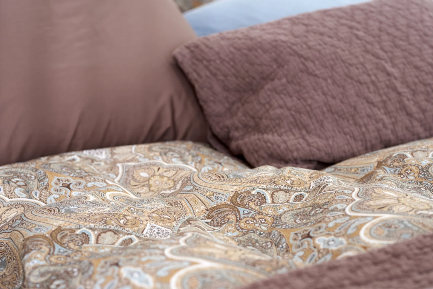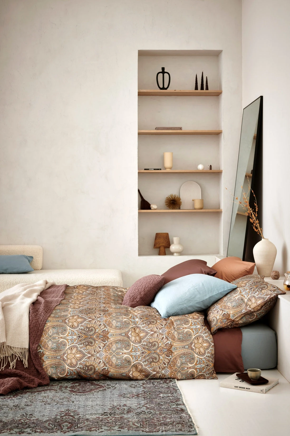 Home 96 is te herkennen aan de prachtige paisley print. Een echte seventies trend wat nu weer helemaal terug gekomen is. Het dekbedovertreksetset is gemaakt van een mooie luxe katoensatijn (300 thread count). De voorzijde van de dekbedovertrekset heeft een print en de achterzijde is effen. De slopen hebben aan beide zijde dezelfde print en zijn afgewerkt met een piping in bijpassende kleur. Bij dit mooie dekbedovertrekset hebben we een bijpassende badjas: Emma.