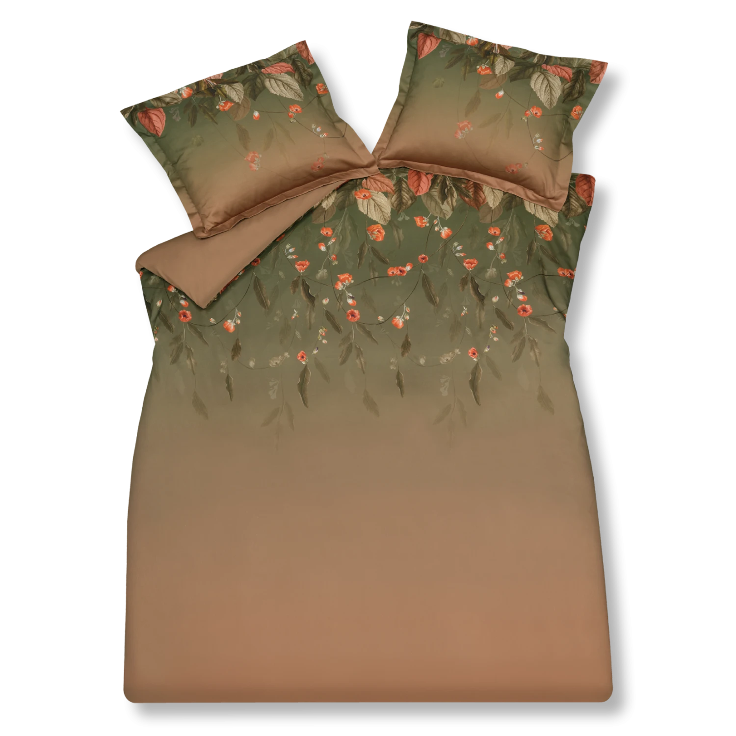 Het Oak multi dekbedovertrek is te herkennen aan de prachtige bruine en groene kleuren en met een waanzinnige afwerking van rode bloemen en bladeren. De diepe herfsttinten hebben een luxe uitstraling en de lieflijke rode bloemen zijn de perfecte afwerking voor het dekbedovertrek. De achterkant is effen bruin van kleur en de kussens zijn versierd met bladeren en bloemen.
