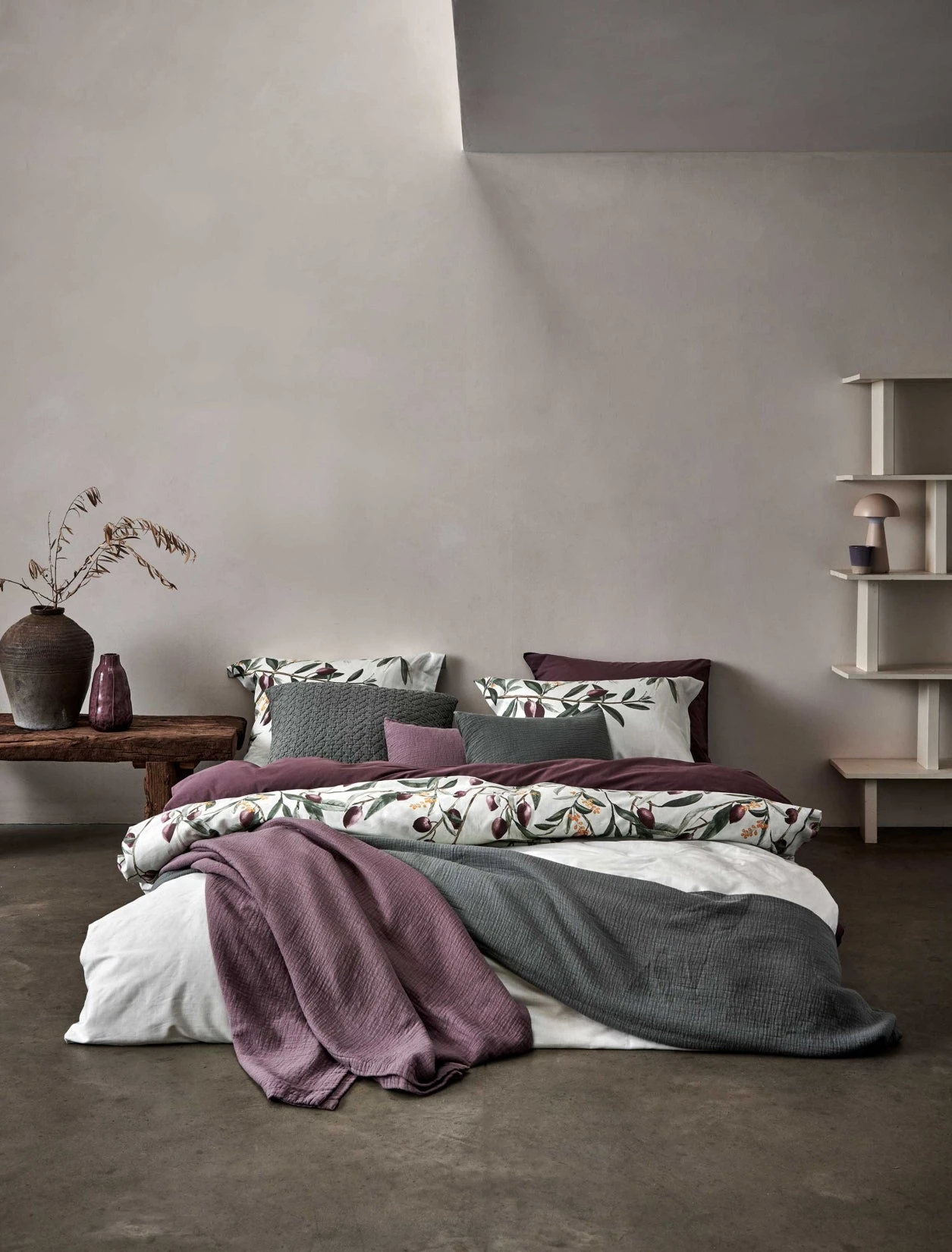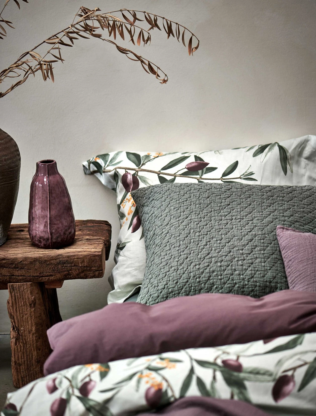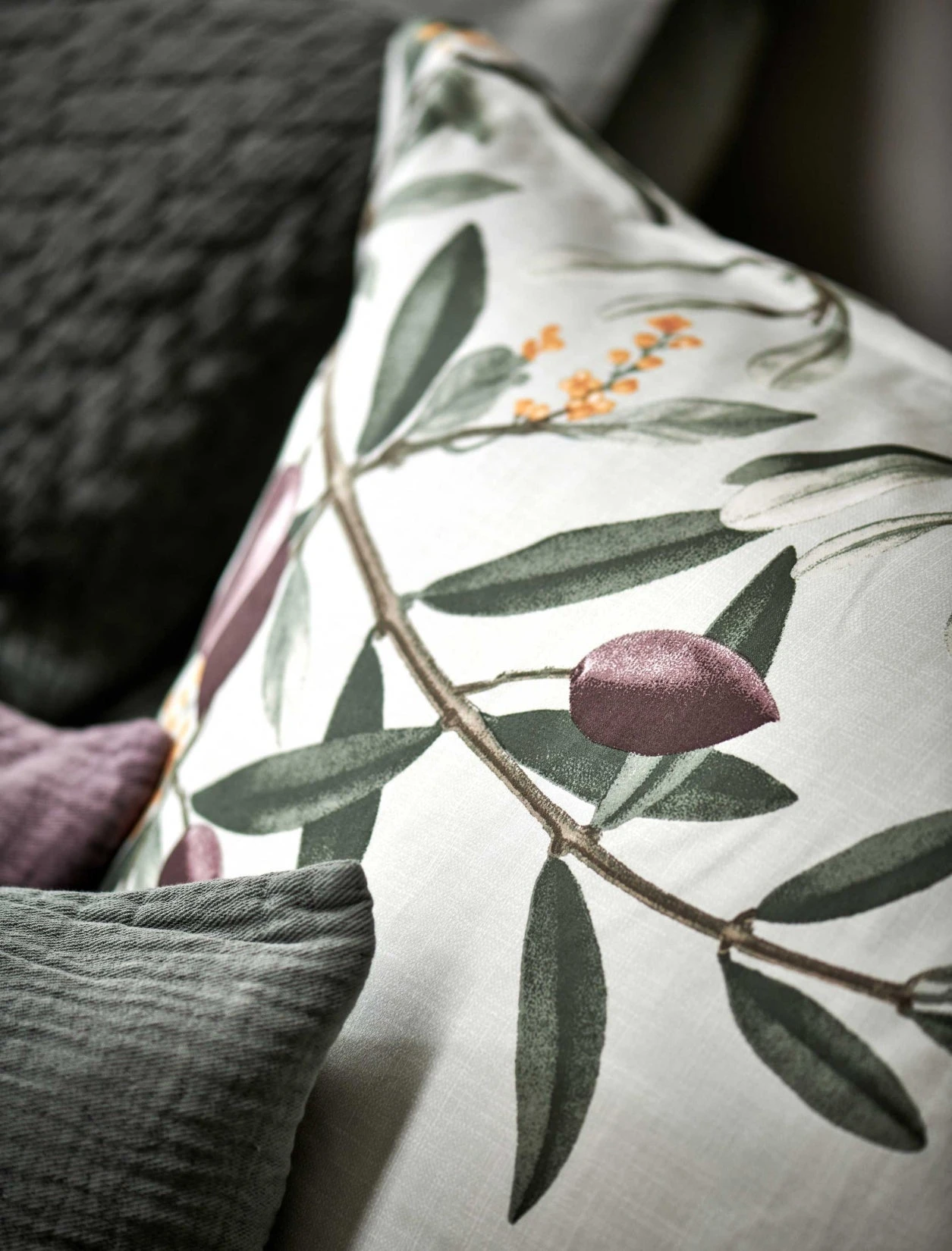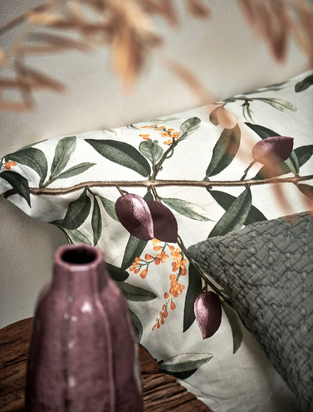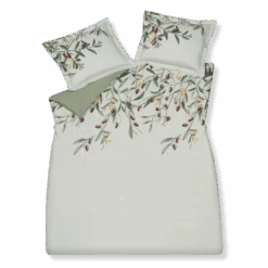 Olive multi dekbedovertrek heeft aan de bovenkant takken met blaadjes en olijven op een lichtgroene achtergrond. De achterkant van het dekbedovertrek is effen groen. De kussens hebben aan beide zijden in de linker bovenhoek een tak met olijven. Olive multi dekbedovertrek van Vandyck geeft een mediterraanse look aan je slaapkamer. Combineer met het Green Gift dekbedovertrek. Het is gemaakt van 100% katoen hierdoor is het materiaal sterker, maar voelt het toch zacht aan. Het is een ademend en zacht materiaal dat een comfortabele nachtrust garandeert. Het katoen zorgt ervoor dat je huid kan ademen en reguleert de temperatuur, waardoor je het hele jaar door kunt genieten van een aangename slaapomgeving.