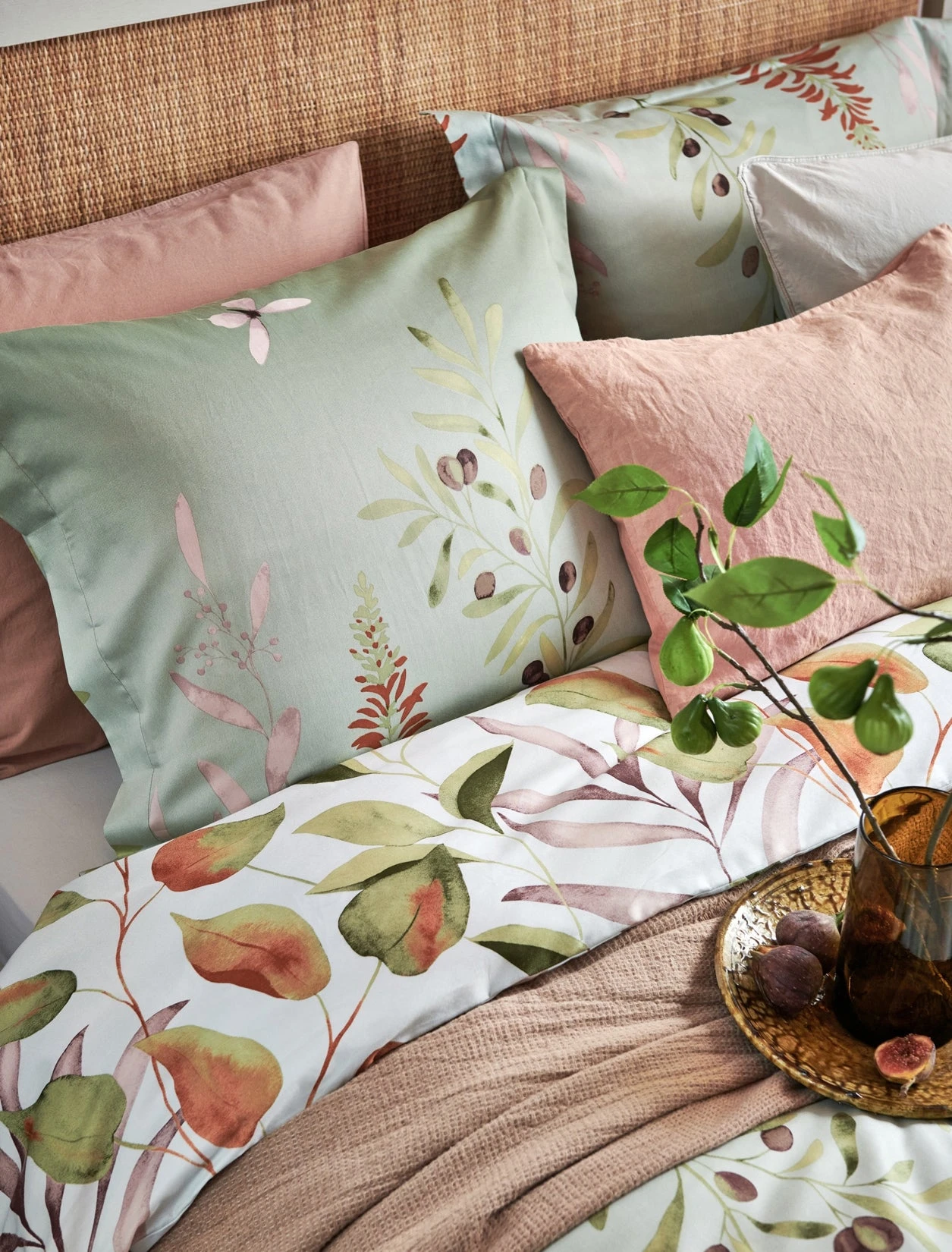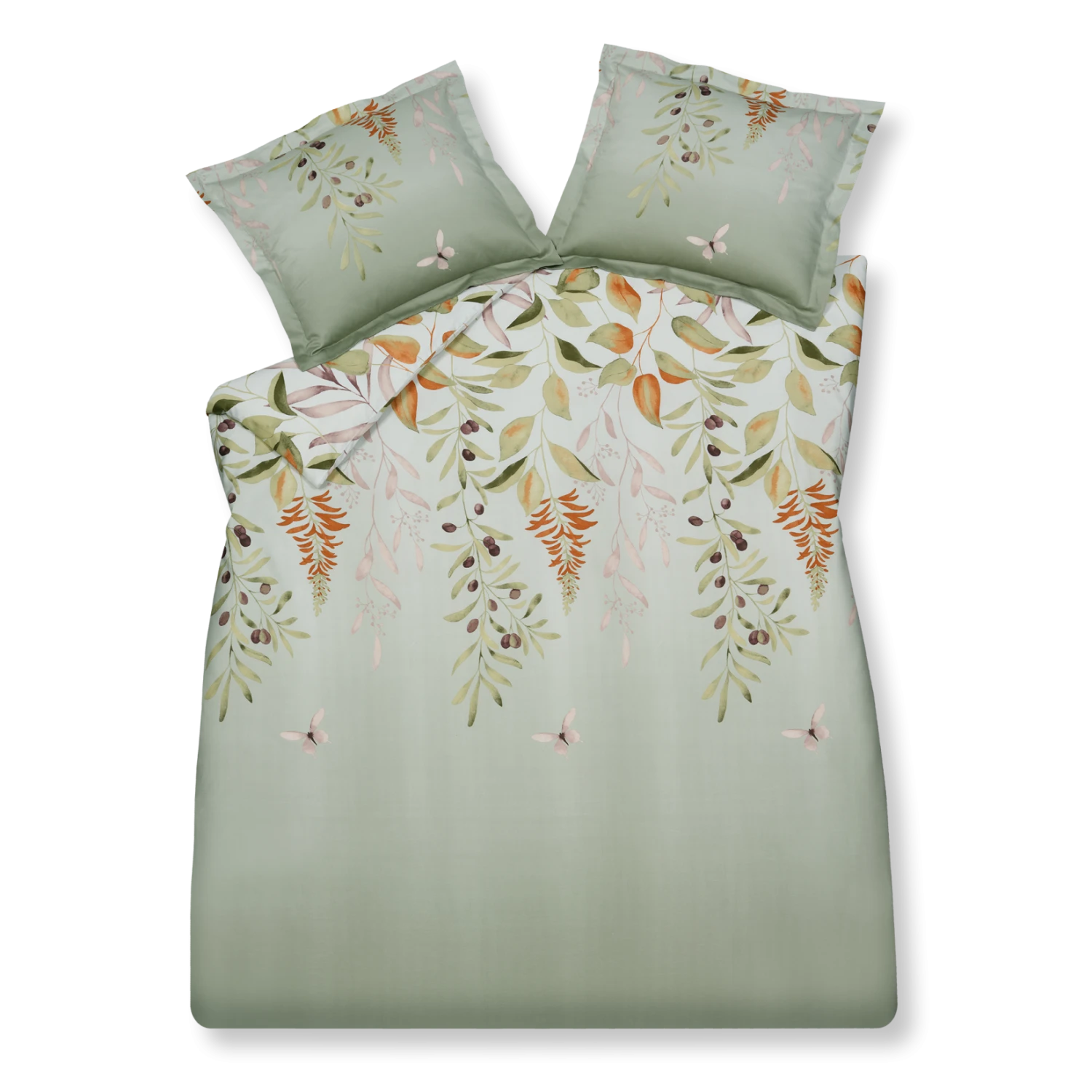 Het Oliver smoke green dekbedovertrek is te herkennen aan de prachtige groene, oranje en roze kleuren die de bovenkant van de overtrekset sieren. De print aan de bovenkant bestaat uit verschillende bladeren, takken met olijven en bloemen die samen een prachtig geheel vormen. Daarnaast zijn er verschillende roze vlinders te spotten. De print siert ook beide kussens en de binnenkant van de overtrekset.
