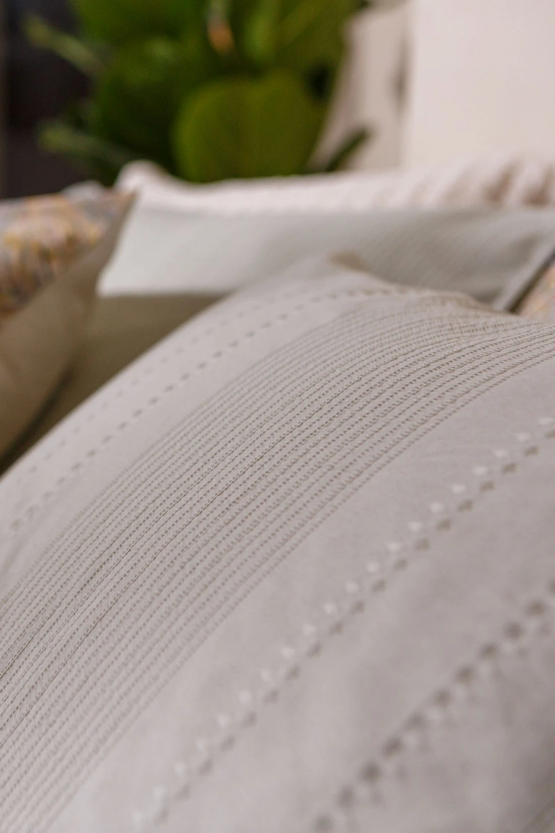 Pure 24 is een luxe jacquard geweven dekbedovertrekset. De voorzijde heeft een rijk geweven structuur met verschillende lijnen die op diverse manieren geweven zijn. De achterkant van het dekbedovertrek is effen. De kussens hebben aan de voorkant dezelfde geweven patronen en de achterkant is effen. Pure 24 off white dekbedovertrek van Vandyck geeft een romantische look aan je slaapkamer. Dit dekbedovertrek is gemaakt van 100% katoen en voelt heerlijk zacht en soepel aan.