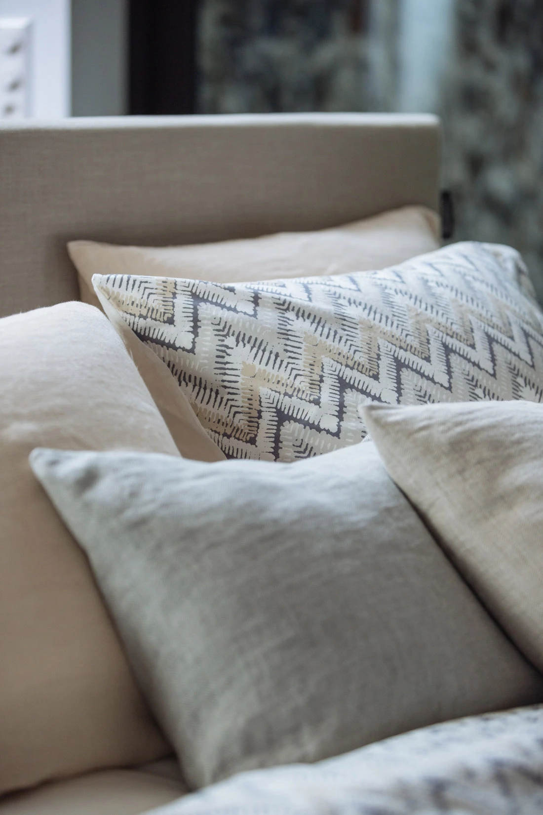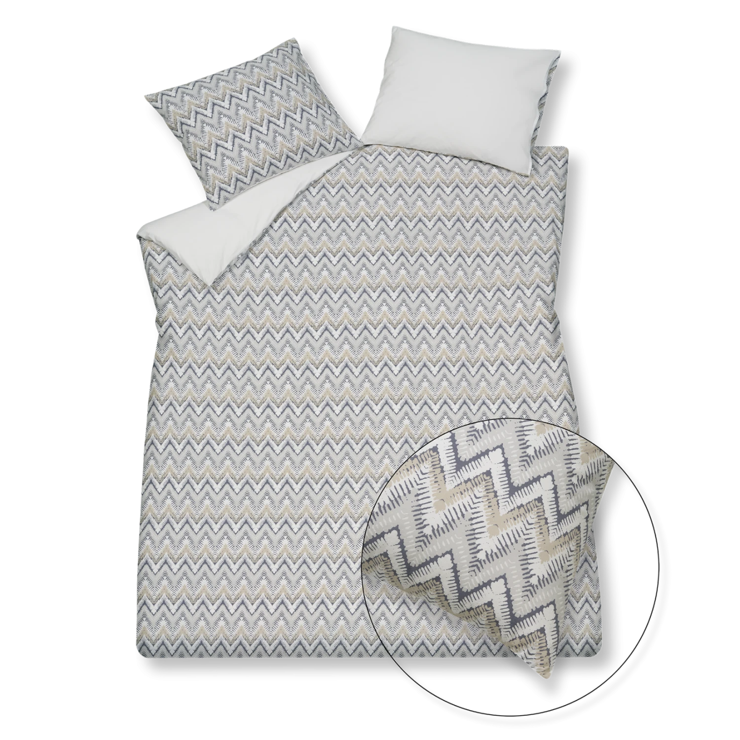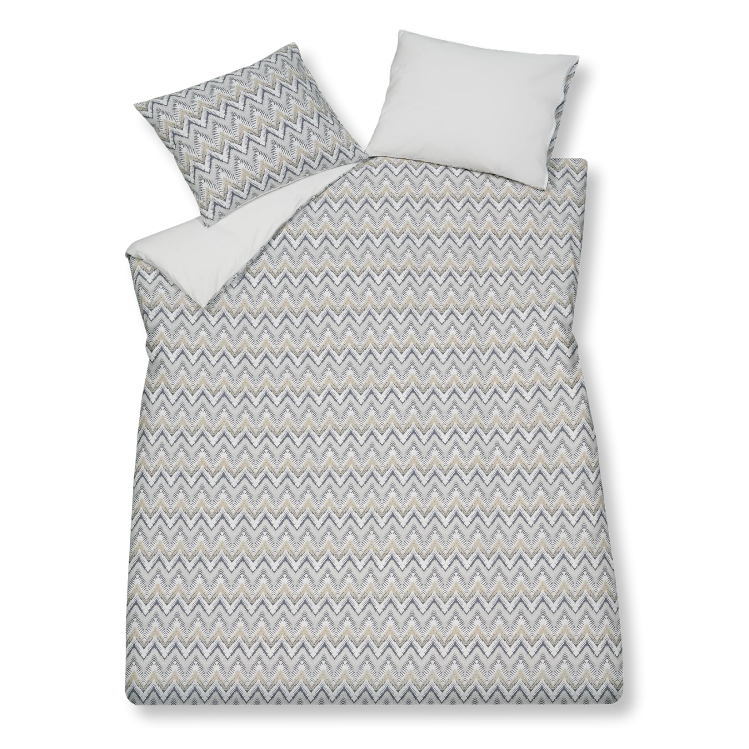 Het Pure 61 dekbedovertrek is te herkennen aan de verschillende grijstinten met beige en witte accenten. De zigzag print met verschillende kleuren geeft je slaapkamer een zomerse uitstraling. De achterkant van het dekbedovertrek is effen wit en de print siert ook beide kussens.