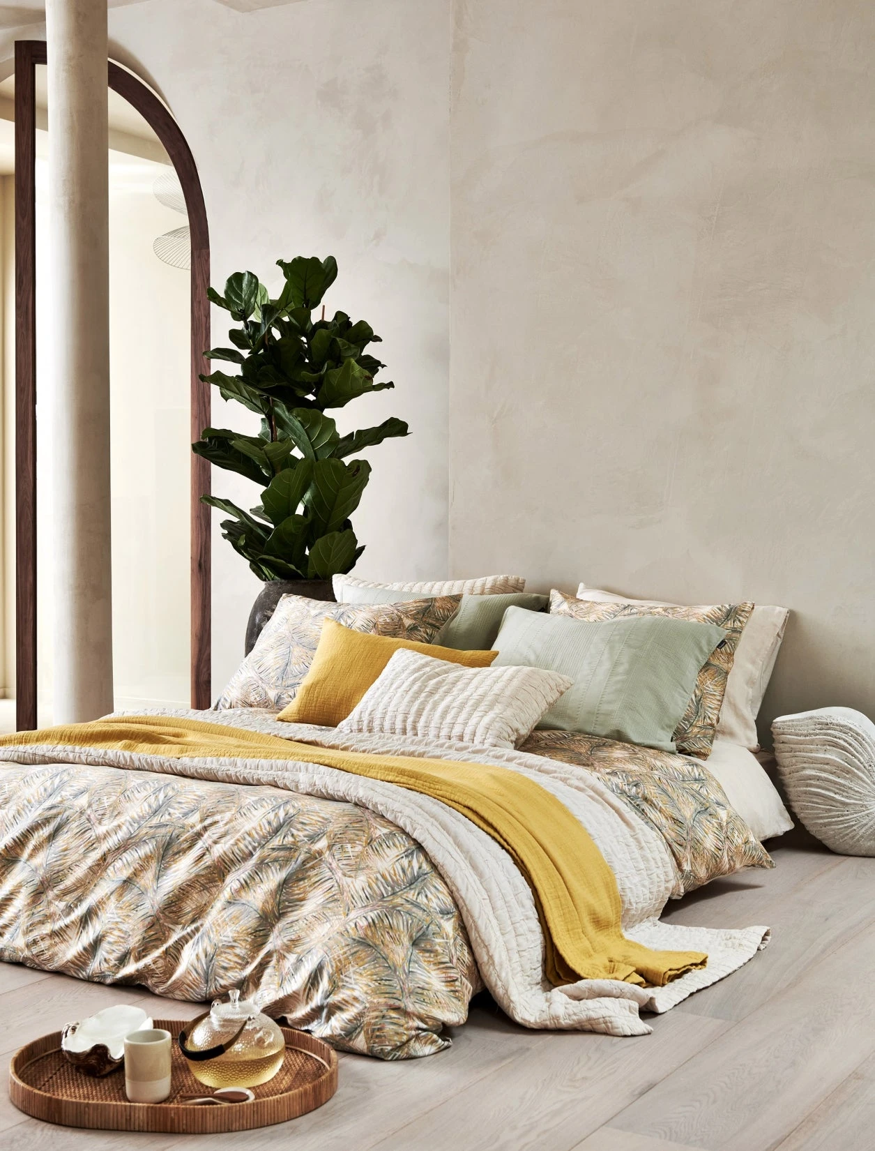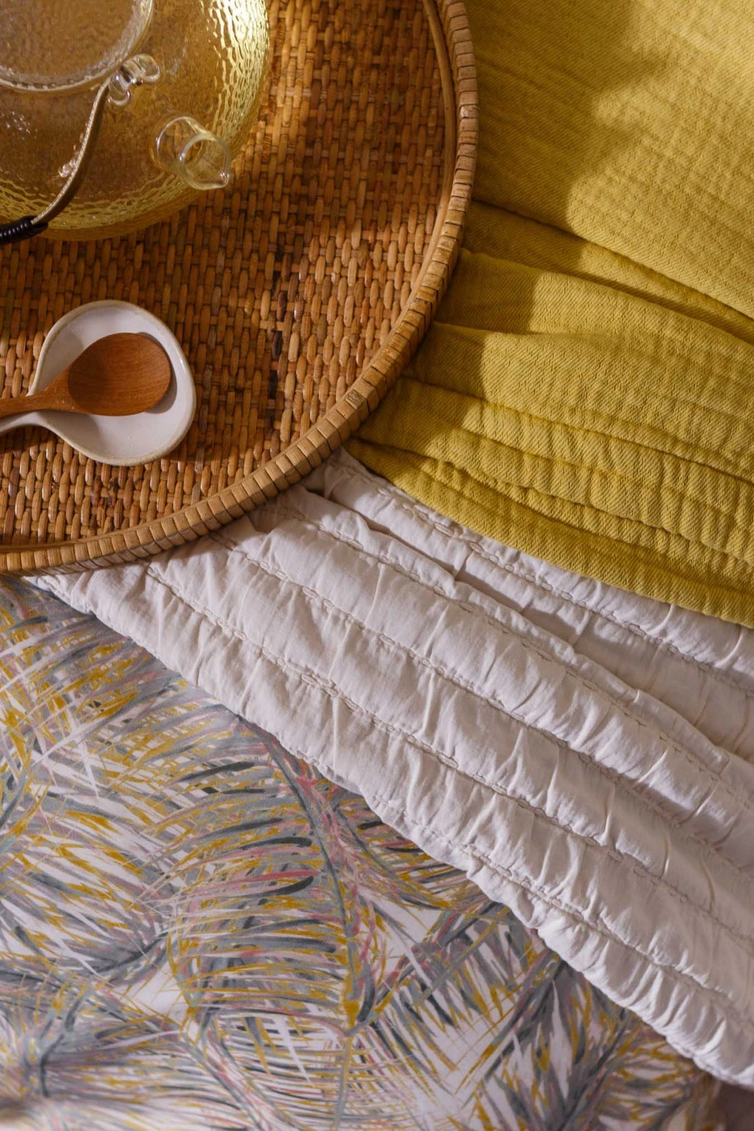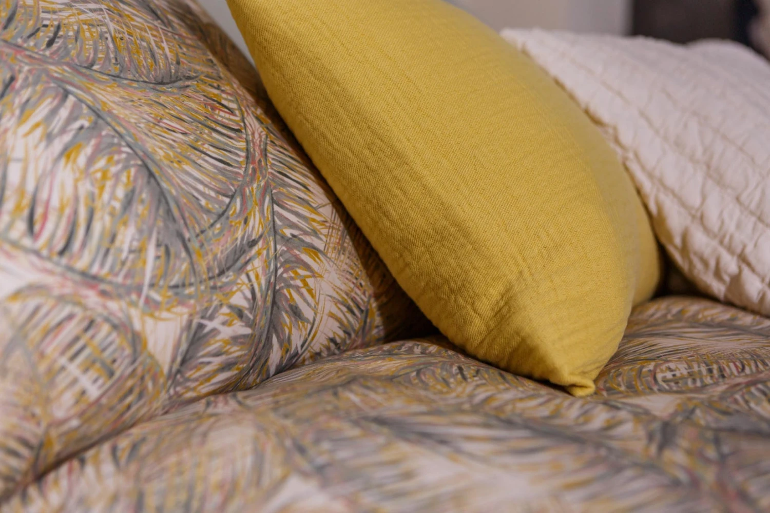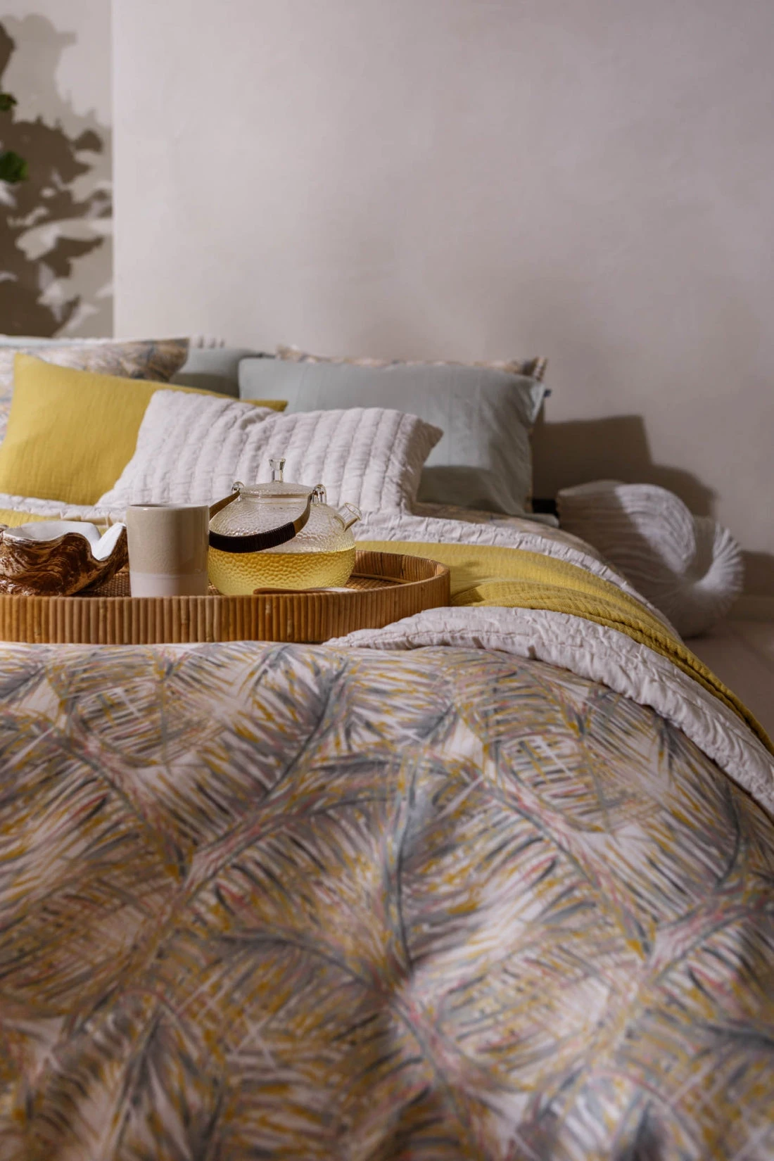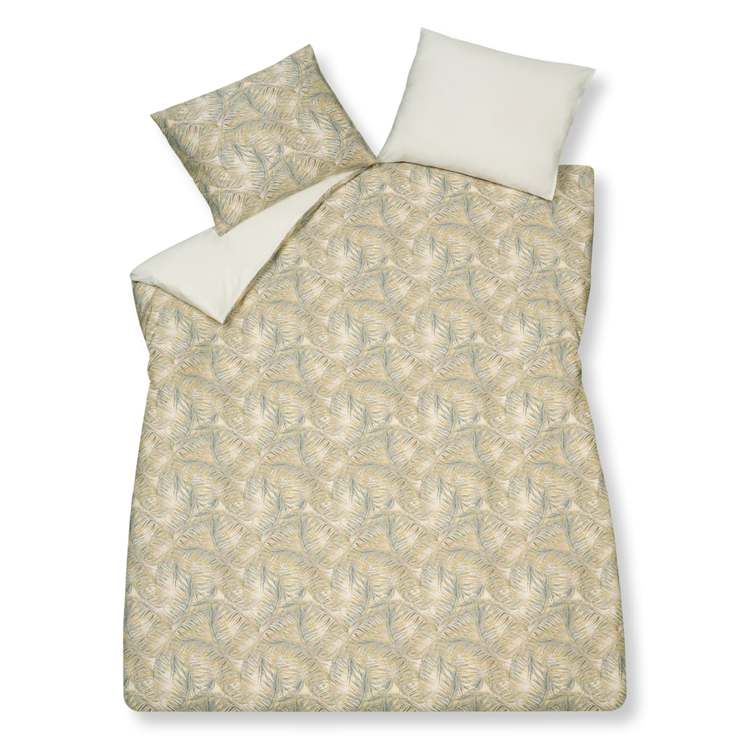 Pure 67 multi dekbedovertrek lijkt bedekt te zijn met palmbladeren in verschillende tinten groen, geel en roze accenten op een ivoor achtergrond. De achterkant van het dekbedovertrek is effen ivoor. De kussens hebben aan de ene kant dezelfde palmbladeren en aan de andere kant is het effen ivoor. Door de digitale druk, komt de levensechte print helemaal tot leven. Pure 67 multi dekbedovertrek van Vandyck geeft op subtiele wijze een tropische uitstraling aan je slaapkamer. Het is gemaakt van 100% katoensatijn hierdoor voelt het heerlijk zacht en soepel aan. Dit dekbedovertrek is ook leuk te combineren met onze Pure 64 spei en kussensloop in de kleur cream tan. Ga je voor meer contrast? Combineer het dan met de Pure 68 plaid en sierkussen in de kleur sunlight.