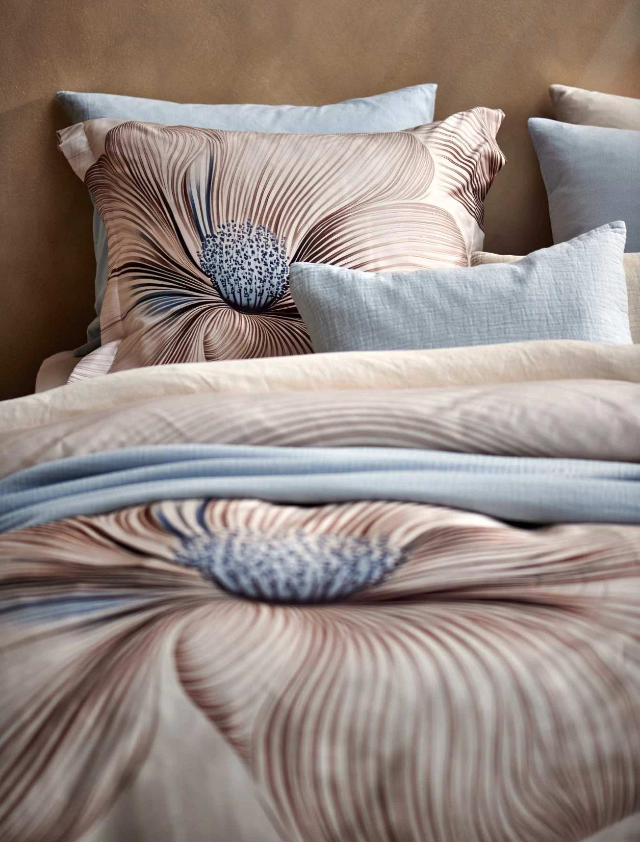 Royal Garden cream tan dekbedovertrek heeft enorme bloemen waarvan de bladeren gevormd zijn door lijnen en het hart van de bloem door blauwe stippen op een licht beige achtergrond met golvende lijnen. De achterkant van het dekbedovertrek is effen licht beige. De kussens hebben aan beide kanten een grote bloem. De bladeren van de bloemen van Royal Garden cream tan dekbedovertrek van Vandyck lijken haast op zacht deinsende soundwaves, die je in totale ontspanning brengen en in slaap wiegen. Dit 100% katoensatijnen dekbedovertrek biedt een luxueuze en comfortabele slaapervaring dankzij de zachte, soepele textuur en ademende eigenschappen. Het speciale weefsel van fijne katoengaren zorgt voor een glad oppervlak en lichte glans. Hierdoor voelt het heerlijk zacht op de huid, wat zorgt voor comfortabel slapen. Bovendien reguleert katoen van nature de lichaamstemperatuur en absorbeert het vocht, wat resulteert in een aangenaam slaapklimaat en goede nachtrust.