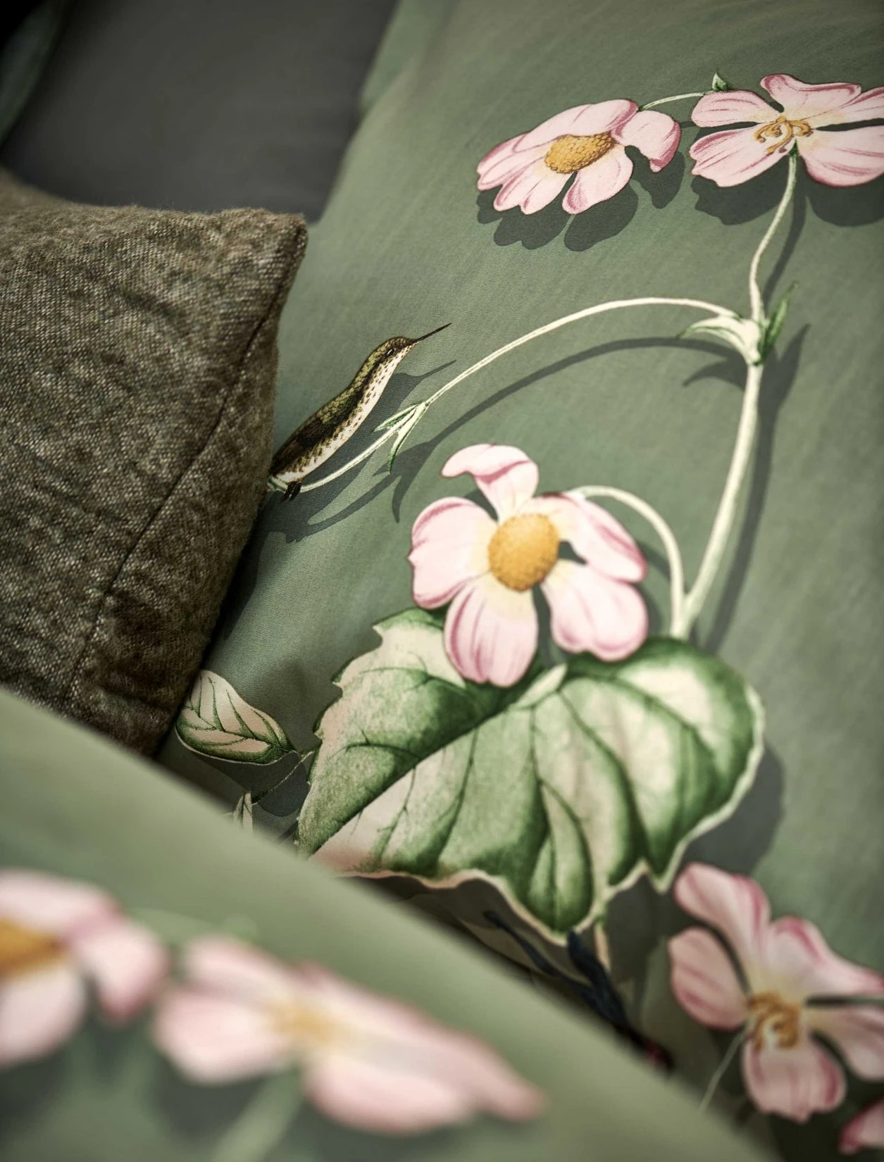 Starling smoke green dekbedovertrek heeft verschillende roze bloemen en blaadjes met allerlei vogels op een donkergroene achtergrond. De achterkant van het dekbedovertrek heeft dezelfde print. De kussens hebben aan beide zijden enkele roze bloemen en twee vogels. Starling smoke green dekbedovertrek van Vandyck heeft een knusse uitstraling door de vogels die met elkaar lijken te kletsen. Combineer met het Green Gift dekbedovertrek. Het is gemaakt van 100% katoen hierdoor is het materiaal sterker, maar voelt het toch zacht aan. Het is een ademend en zacht materiaal dat een comfortabele nachtrust garandeert. Het katoen zorgt ervoor dat je huid kan ademen en reguleert de temperatuur, waardoor je het hele jaar door kunt genieten van een aangename slaapomgeving.