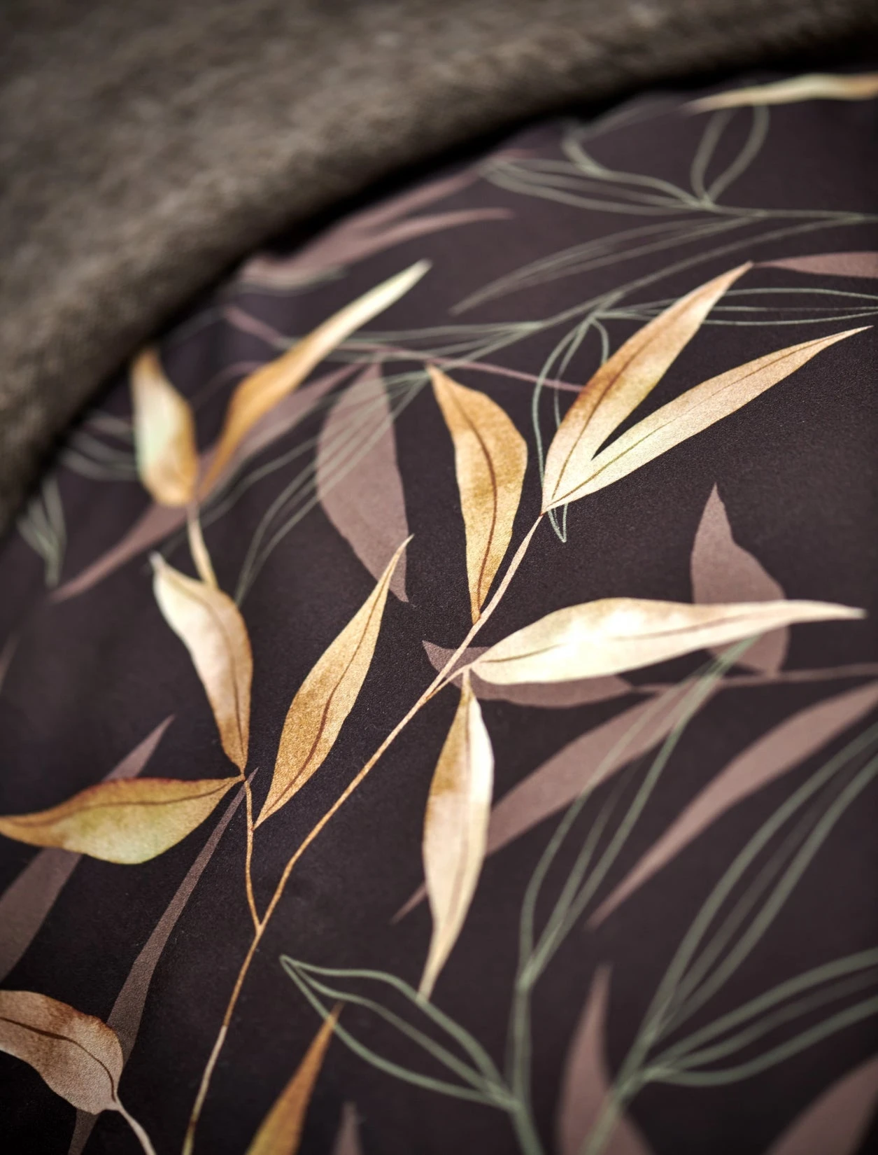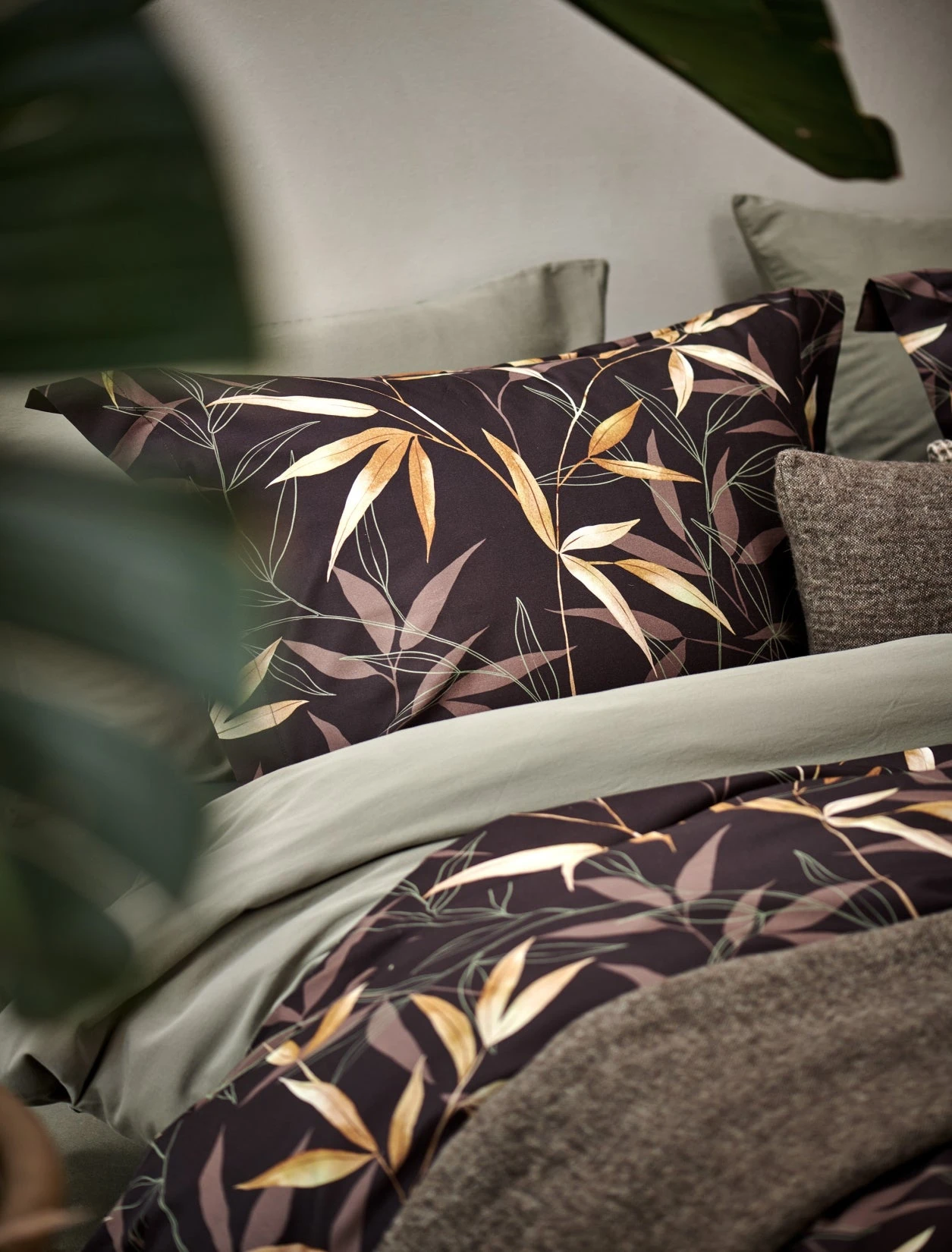 Zen Garden dark chocolate dekbedovertrek heeft fijne blaadjes in bruin en geel en in groene lijnen op een donkerbruine achtergrond. De achterkant van het dekbedovertrek is effen bruin. De kussens hebben aan beide zijden dezelfde bloemen. Door de digitale druk, komt de levensechte print helemaal tot leven. Zen Garden dark chocolate dekbedovertrek van Vandyck geeft je net als de blaadjes een vederlicht gevoel. Zo kun je je gedachtes weer ordenen en met een frisse blik de dag weer aan. Combineer met Pure 84 thyme. Dit 100% katoensatijnen dekbedovertrek biedt een luxueuze en comfortabele slaapervaring dankzij de zachte, soepele textuur en ademende eigenschappen. Het speciale weefsel van fijne katoengaren zorgt voor een glad oppervlak en lichte glans. Hierdoor voelt het heerlijk zacht op de huid, wat zorgt voor comfortabel slapen. Bovendien reguleert katoen van nature de lichaamstemperatuur en absorbeert het vocht, wat resulteert in een aangenaam slaapklimaat en goede nachtrust.